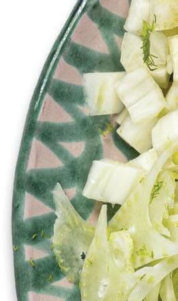 has to be the best fennel value in town). To clean a head of fennel, cut the stalks away from the bulb, trim the root end, and if the outside layer is very thick or tough and gnarly looking, peel o the outside layer. You can also, with a vegetable peeler, peel just the surface of the outer layer to remove any damaged areas if the head appears young and tender. Rinse the bulb, and you are ready to cut. I have two favorite ways of cutting fennel for salads depending on how I want to use it. Number one: Lay the head down on its side and cut across the grain as thinly as possible, working from the stem end towards the base—this can be done more easily on a mandolin slicer. is is the primary way for cutting fennel for classic Italian salads like fennel with red onion (and vinaigrette) and fennel with orange or blood orange (and citrus vinaigrette). e second cutting method: With the head standing on its base, cut the bulb in half from top to bottom, then cut out the little V-shaped core at the bottom, which could be tough.Slice the fennel into thin layers like you would to dice an onion, then cut the slices into small cubes. is method is great for applications like a chopped salad (it makes a great addition to a tarragon chickensalad with diced onion , carrot , and celery in a light mayonnaise-based dressing ) or in a salad with chopped nocchiona salami , olives , pine nuts , etc. Fennel, having originated in the Mediterranean, naturally goes with Mediterranean avors like extra-virgin olive oil and countless other seasonings. If you ever run out of ideas, just do a quick internet search for inspiration.