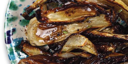 love fennel in all of its guises. It is delicious when raw and crunchy, its assertively clean, green, sweet avor awakening the palate. When braised slowly and caramelized, it becomes mellow and tender, with warm herbal tones that can elegantly accompany many foods. Roasted at high temperature, fennel’s sweetness is accentuated, yet tempered, by bits of dark char, giving it complexity and the boldness to stand up to robustly avored meats. It also slides comfortably into the role of dessert, its anise-like licorice notes serving both as an elegant avoring and an aid to digestion. What’s not to love?