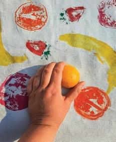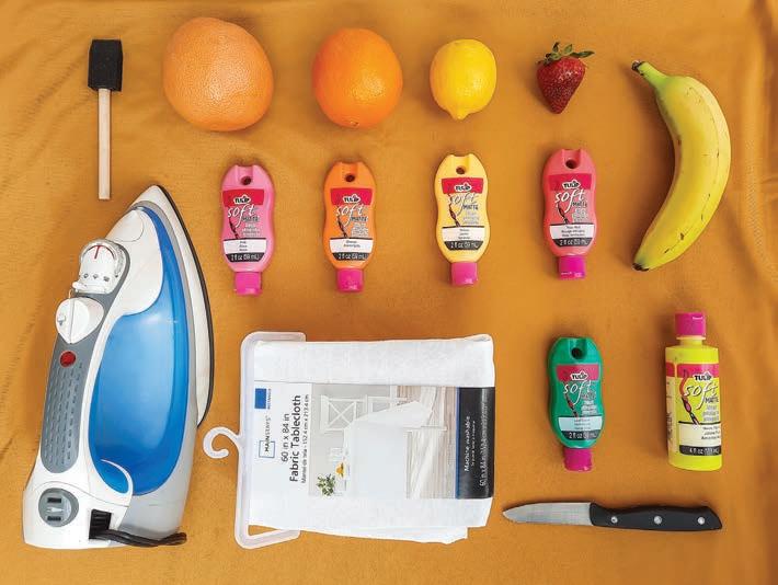 Firmly press the painted side of the fruits onto the tablecloth and lift straight up to remove. Alternate fruits to create a pattern.