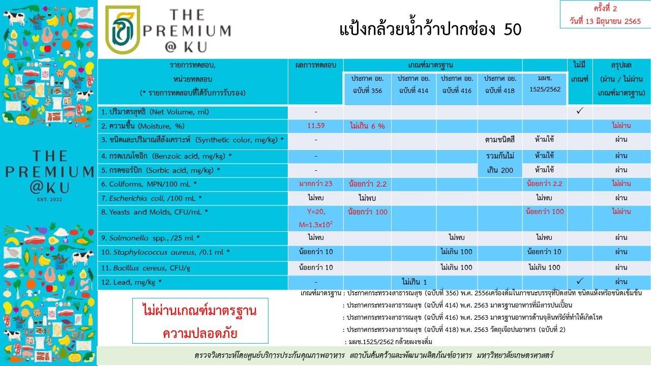 , CFU/mL น้อยกว่า 1 น้อยกว่า 100 ผ่าน 12. Clostridium perfringens, CFU/mL น้อยกว่า 1 น้อยกว่า 100 ผ่าน เกณฑ์มาตรฐาน : ประกาศกระทรวงสาธารณสุข (ฉบับที่ 356) พ.ศ. 2556 เครื่องดื่มในภาชนะบรรจุที่ปิดสนิท พาสเจอร์ไรส์ สูงกว่า 4.3 : ประกาศกระทรวงสาธารณสุข (ฉบับที่ 414) พ.ศ. 2563 มาตรฐานอาหารที่มีสารปนเปื้อน : ประกาศกระทรวงสาธารณสุข (ฉบับที่ 416) พ.ศ. 2563 มาตรฐานอาหารด้านจุลินทรีย์ที่ทำให้เกิดโรค : ประกาศกระทรวงสาธารณสุข (ฉบับที่ 418) พ.ศ. 2563 วัตถุเจือปนอาหาร (ฉบับที่ 2) ไม่ผ่านเกณฑ์มาตรฐาน ตามประกาศ อย.ฉบับที่ 356