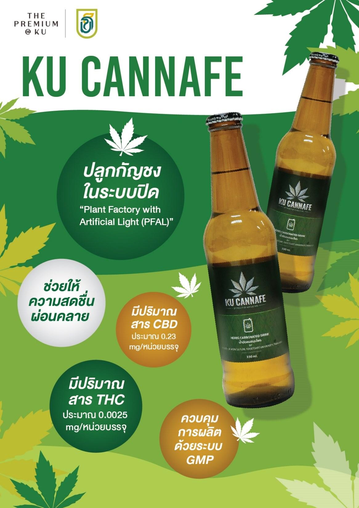 22 2 เครื่องดื่มอัดลมสมุนไพร สูตรดั้งเดิม (The PREMIUM@KU) ประวัติความเป็นมา (ผลิตภัณฑ์/ สถานที่ผลิต) กัญชาและกัญชง ถือเป็นพืชที่มีศักยภาพในการเป็นพืชเศรษฐกิจ โดยเฉพาะการนำมาใช้ประโยชน์ ในทางการแพทย์และสุขภาพ อย่างไรก็ตาม กัญชาและกัญชงยังจัดให้เป็นยาเสพติดประเภทที่ 5 อยู่ ดังนั้น การผลิต จำหน่าย นำเข้า ส่งออก หรือมีไว้ในครอบครอง ต้องได้รับอนุญาตจากสำนักงานคณะกรรมการอาหาร และยา (อย.) ก่อนจึงจะดำเนินการได้ ปัจจุบันรัฐบาลไทยได้มีการแก้กฎหมายใหม่เพื่อเปิดโอกาสให้นำกัญชา และกัญชงไปศึกษาและวิจัยเพื่อประโยชน์ทางการแพทย์ และต่อยอดพัฒนาเป็นผลิตภัณฑ์สุขภาพต่าง ๆ ได้ ทำให้พืชนี้ได้รับความสนใจในการปลูกเชิงพาณิชย์และอุตสาหกรรมมากขึ้น คณะเกษตร มหาวิทยาลัยเกษตรศาสตร์ จึงได้พัฒนาโครงการวิจัยเรื่อง “การพัฒนาต้นแบบวิธีการปลูกและการสกัด สารสำคัญจากกัญชา/กัญชงเพื่อใช้ประโยชน์ทางการแพทย์” ขึ้น โดยมีวัตถุประสงค์เพื่อพัฒนาระบบการปลูก กัญชา/กัญชง ในระบบปิด (indoor) และพัฒนาวิธีการสกัดสารสำคัญจากกัญชา/กัญชงเพื่อใช้ประโยชน์ทาง การแพทย์ โดยเริ่มดำเนินการมาตั้งแต่ปี พ.ศ. 2563 เป็นต้นมา โดยโครงการฯ ได้รับใบอนุญาตนำเข้า ผลิต และจำหน่าย ซึ่งยาเสพติดให้โทษประเภท 5 จากสำนักงานคณะกรรมการอาหารและยา (อย.) กระทรวง สาธารณสุข อย่างถูกต้องตามกฎหมาย นอกจากนั้นยังได้รับการอนุญาตจาก อย. ให้สามารถจำหน่ายใบ กิ่ง ลำ ต้น ราก กากที่เหลือจากการสกัดกัญชา/กัญชง และผลิตภัณฑ์จากกัญชา/กัญชงได้ ซึ่งทางโครงการฯ ได้ใช้ส่วน ของใบมาเพิ่มมูลค่าด้วยการแปรรูปโดยการนำมาทำน้ำอัดลมสมุนไพรกัญชา โดยมีแนวคิดที่จะทำให้สมุนไพร ไทยนั้นสามารถรับประทานหรือดื่มได้ง่ายขึ้นและเป็นเครื่องดื่มที่ชื่นชอบของทุกเพศทุกวัยและส่งเสริม ผลิตภัณฑ์ไทยให้ก้าวไกลสู่ตลาดโลกเป็นที่รู้จักและยอมรับในต่างชาติภายใต้แบรนด์ KU CANNAFE และยัง ส่งเสริมให้เกษตรกรไทยหันมาสนใจปลูกพืชกัญชาและกัญชงอย่างถูกวิธีเพิ่มมากขึ้นส่งผลให้มีแรงขับเคลื่อน พัฒนาเศรษฐกิจไทยให้เจริญก้าวหน้าอย่างยั่งยืน กระบวนการผลิต เริ่มจากการคัดวัตถุดิบต่างๆ เช่น อบเชย ขมิ้น กัญชง เป็นต้น ที่นำเข้ามายังโรงงานจากนั้นเข้าสู่ กระบวนการล้างทำความสะอาดและตัดตกแต่งบางส่วนที่ไม่ต้องการออก เมื่อได้วัตถุดิบที่ต้องการแล้วนำมาบด และชั่งส่วนผสมและนำมาผสมรวมกันให้ส่วนผสมเข้ากันแล้วจึงนำไปต้มด้วยหม้อแรงดันหลังจากผ่านกระบวน การต้มแล้วจะได้หัวเชื้อแล้วจึงนำหัวเชื้อนั้นไปทำการอัดด้วยก๊าซ CO2 หลังจากการผ่านกระบวนกา