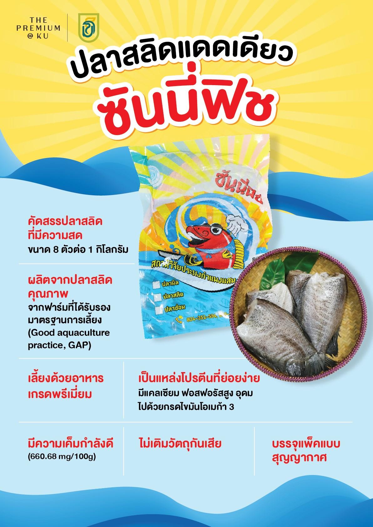 44 พื้นที่โล่ง อากาศถ่ายเท แต่มีการป้องกันแมลงและสิ่งสกปรกจากภายนอก โดยตากเป็นเวลาประมาณ 24 ชั่วโมง จากนั้นนำมาบรรจุแพ็คแบบสุญญากาศ และแช่เยือกแข็งเพื่อรักษาคุณภาพ พร้อมส่งจัดจำหน่าย ความ premium/จุดเด่น ของผลิตภัณฑ์ (The PREMIUM@KU) ผลิตจากปลาสลิดคุณภาพจากฟาร์มที่ได้รับรองมาตรฐานการเลี้ยง (Good aquaculture practice, GAP) ซึ่งเลี้ยงด้วยอาหารเกรดพรีเมียม จึงมั่นใจได้ว่าเนื้อปลาจะไม่มีกลิ่นสาปโคลนที่จะบั่นทอนประสบการณ์ ในการรับประทาน ด้วยวิธีการปรุงจากแม่ครัวที่มีความชำนาญที่ความพิถีพิถัน ปรุงด้วยเกลือธรรมชาติ ซันนี่ ฟิชเข้าใจในไลฟ์สไตล์ของคนเมืองที่เร่งรีบเป็นอย่างดี จึงสรรสร้างบรรจุภัณฑ์เก็บรักษาในระบบสุญญากาศที่ ออกแบบมาเป็นอย่างดีเพื่อเก็บรักษาความอร่อยไว้ได้นานกว่า 6 เดือน เพื่อส่งมอบความสุขให้แก่ผู้บริโภคได้ ทุกเวลาเพียงเมื่อฉีกซองและนำไปประกอบอาหาร ข้อมูลเพิ่มเติม กระบวนการผลิตถูกสุขลักษณะ ควบคุมด้วยหลักเกณฑ์ที่ดีในการผลิต (Good Manufacturing Practice, GMP) ไม่เติมวัตถุกันเสีย มีความเค็มกำลังดีต่อสุขภาพ และเป็นแหล่งโปรตีนชั้นดี