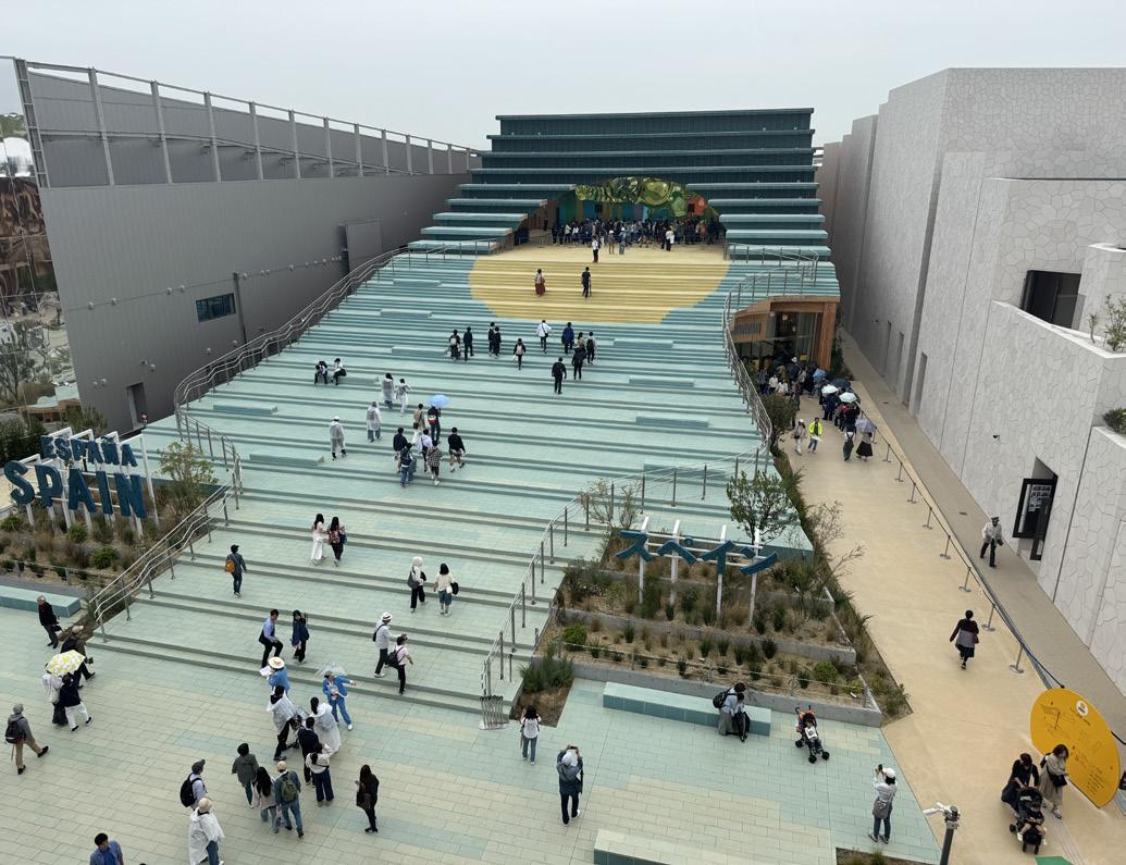Expo 2025 Osaka’s defining feature is The Grand Ring, which encircles the expo site and provides views of the pavilions and surrounding bay area. Shown here from atop The Grand Ring are the France, USA and Philippines pavilions