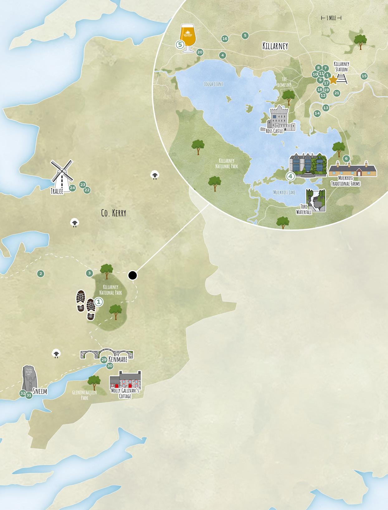Start your day with a stunning walk along the Ardmore cliff followed by a visit to Blarney Castle, home to the magical stone that gives the gift of eloquence in exchange for an upside-down kiss. Stroll through the castle’s grounds and gardens, arboretums and waterways on your private adventure with one of the estate’s Gardeners. If you dare, enter the Poison Garden – just don’t touch the plants! Afterwards, continue to the charming town of Killarney. (B)