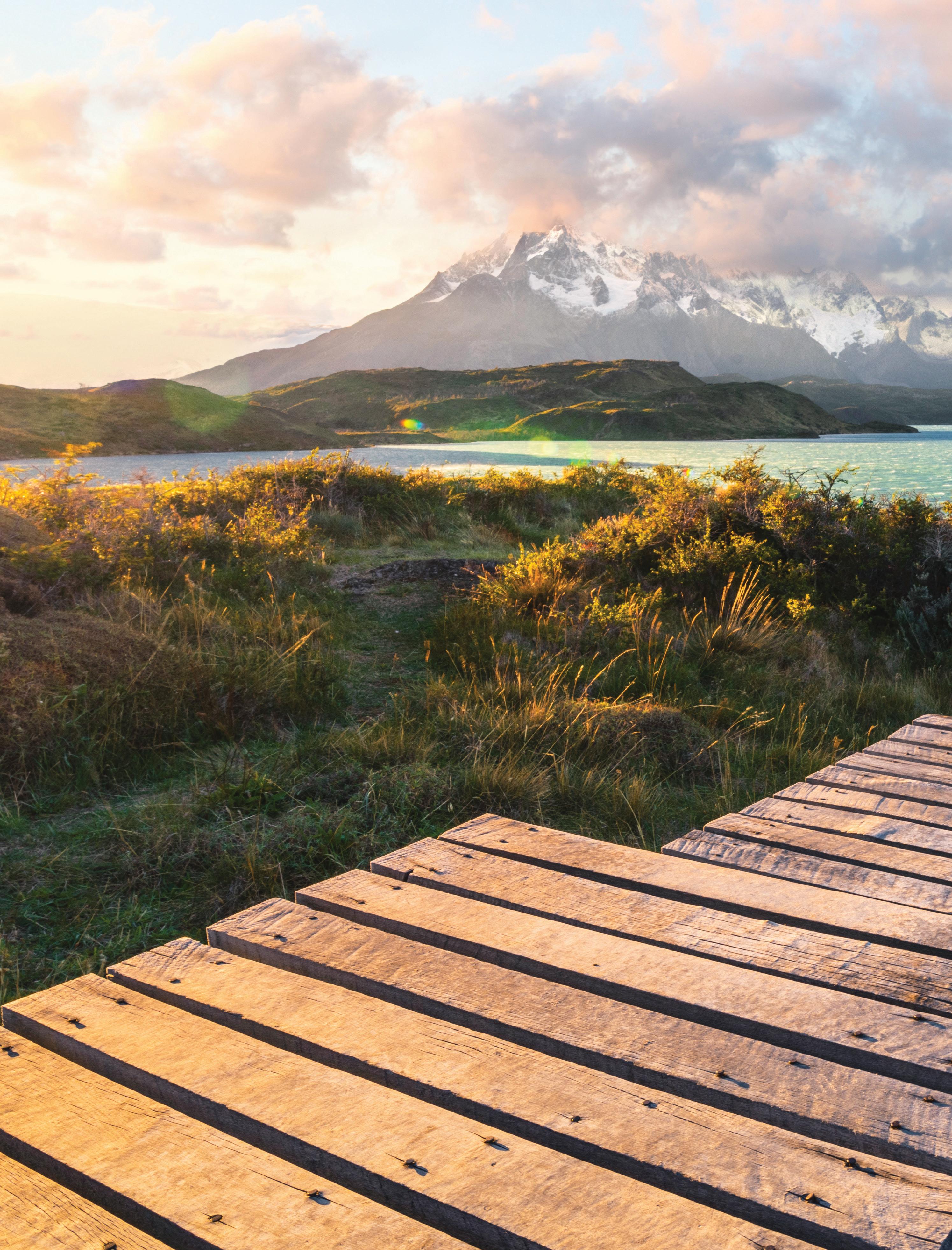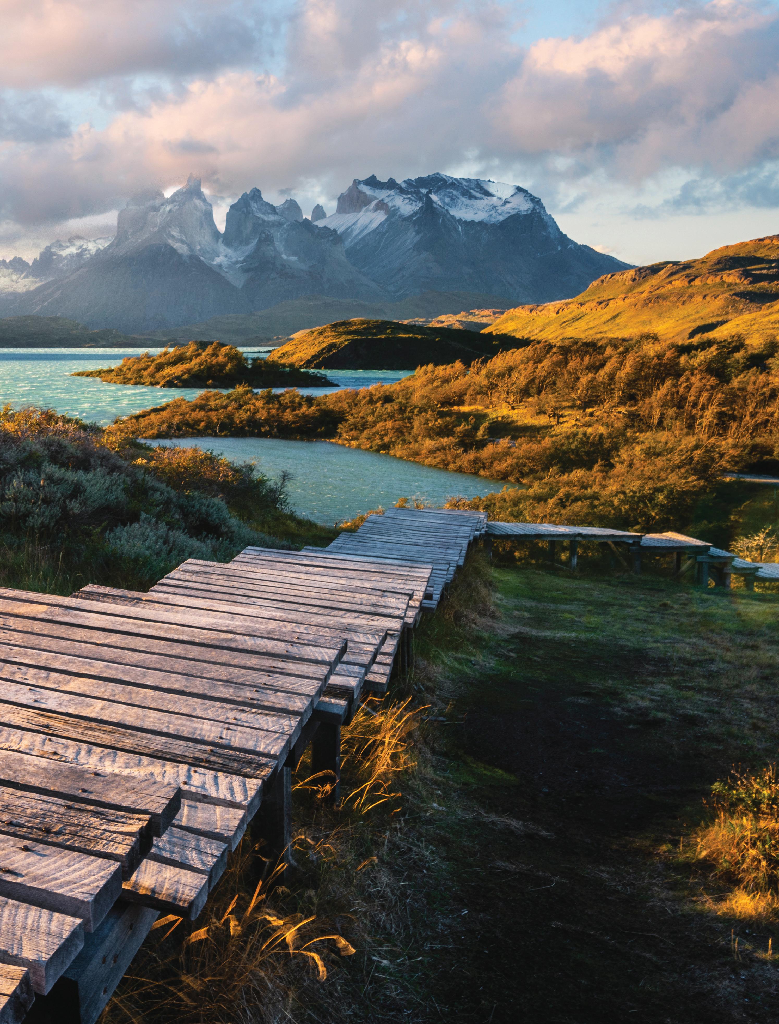 From scenic boardwalks winding through windswept grasslands and glacial lakes, visitors are treated to views of floating icebergs, roaring waterfalls and the three iconic granite towers that give the park its name — Torres del Paine — meaning ‘Towers of Blue’ in the Tehuelche language. Experience on Heart of Patagonia, page 56.