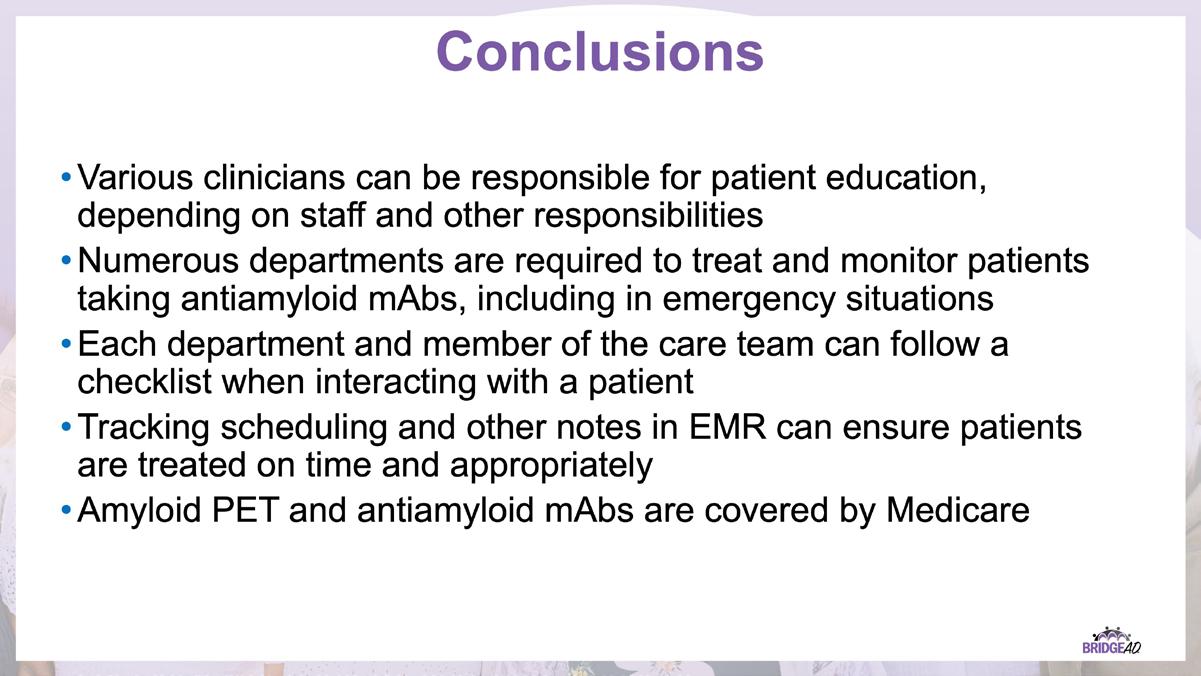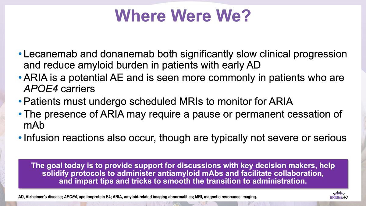 The educational design of this activity addresses the needs of neurology, radiology, emergency, geriatric, and primary care clinicians, and infusion center staff (physicians, nurse practitioners, physician assistants, nurses, and administrative staff) who are involved in the management of patients with Alzheimer’s Disease (AD).