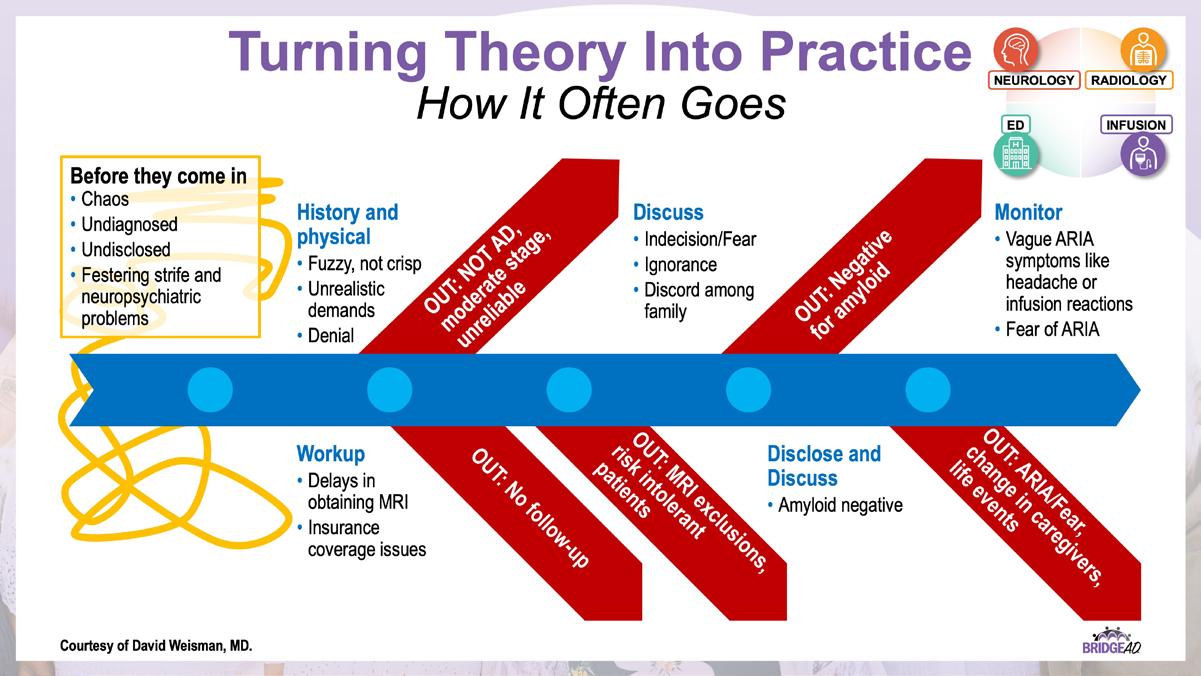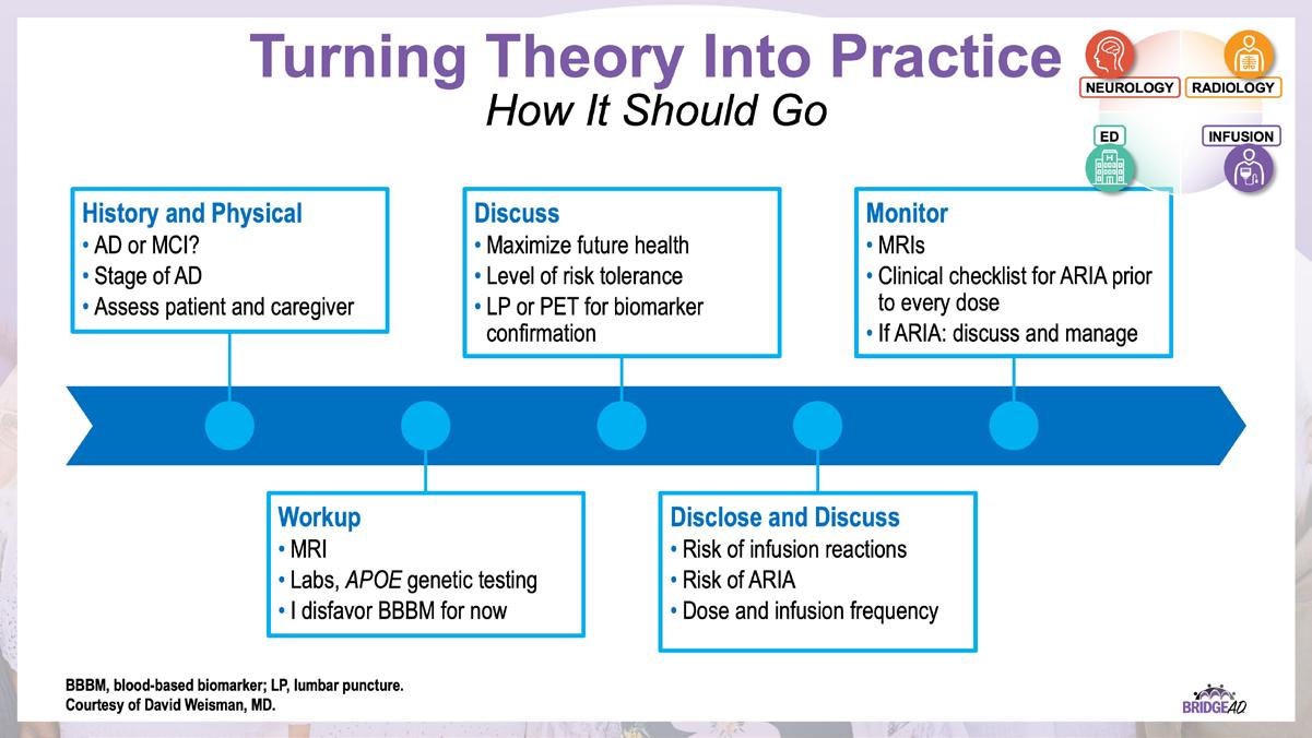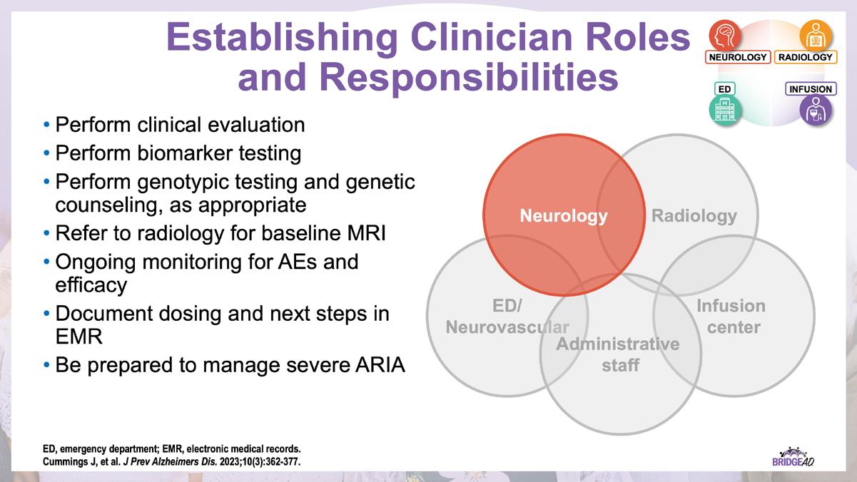 With recent approvals of antiamyloid monoclonal antibodies (mAbs), the field of AD is rapidly changing. Implementation of these therapies requires new protocols and workflows in clinics, including collaboration among multiple departments. This grassroots initiative consists of a 2-part series of live, on-site meetings targeted toward neurology clinicians, radiology clinicians, emergency department staff, and infusion center staff. Drs. Lawrence Honig and David Weisman will discuss details of antiamyloid mAbs, collaboration and communication tips, and best practices for developing implementation protocols. They will also help troubleshoot each location’s protocol development. Participating locations will receive numerous handouts and checklists that will aid in development and implementation of these novel protocols and new workflow procedures.