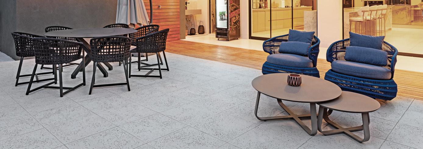 Na área externa, piso em granito Siena (Marmoraria Design) e piscina revestida com pedra Hijau, da Lantai. A Trevizan Casa é responsável pelo fornecimento e instalação do sistema de maquinário da piscina. Espreguiçadeiras, mesa e cadeiras são ideais para contemplar o paisagismo tropical, com plantas da Verde Flora Paisagismo