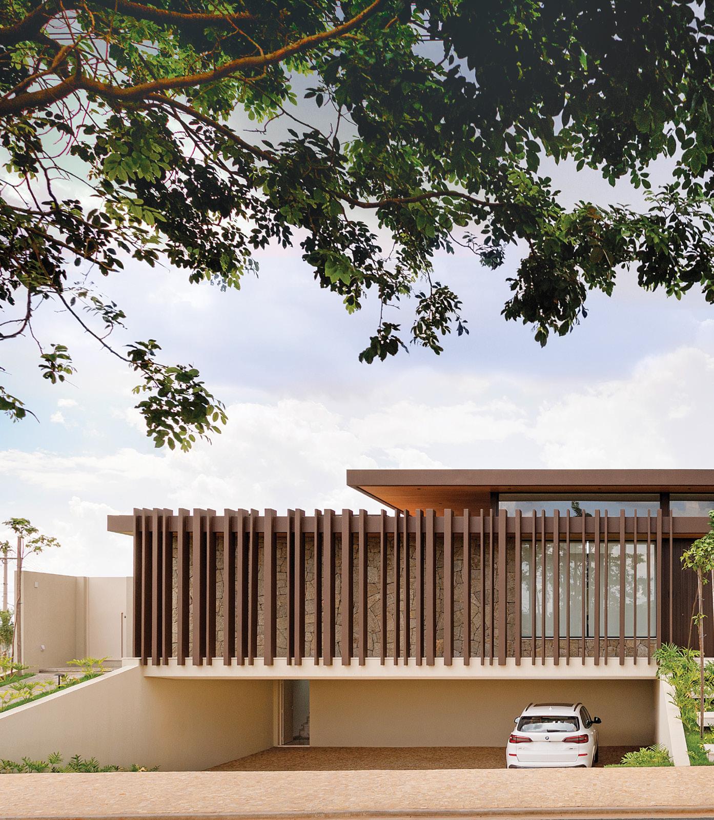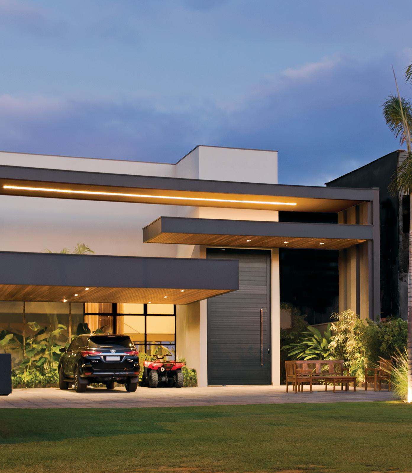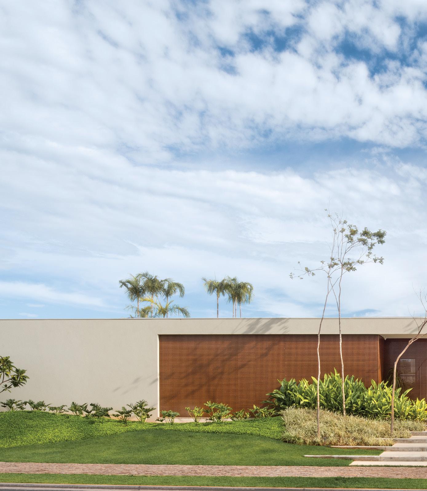 A fachada linear revela a amplitude da arquitetura, que mistura texturas como concreto armado e muxarabis em alumínio com acabamento que remete à madeira (Excellent Esquadrias), garantindo privacidade sem comprometer a luminosidade dos ambientes. A iluminação é da Lightsource. Executada por César Riberto Borges de Carvalho, a obra conta com sistema fotovoltaico da MVM Engenharia Elétrica
