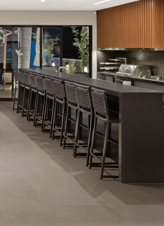 A cozinha se integra parcialmente com a sala de jantar e totalmente com a piscina, através das amplas portas de correr (Atalumínio), servindo como varanda gourmet ao receber convidados. A marcenaria com portas amadeiradas combina com a base cinza presente no piso Porcelanato Ms. Barcelona e na bancada em porcelanato Filó Greige Natural, ambos da Portobello, além das paredes (Estoque Tintas). O ambiente conta com churrasqueira e coifa da Rancho’s Grill
