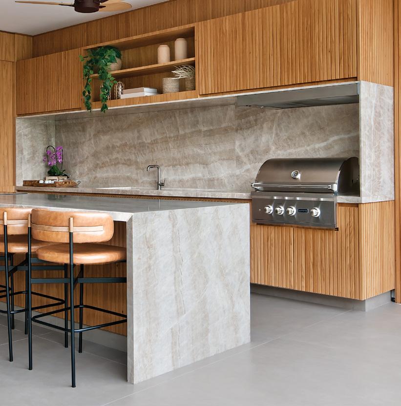 O espaço gourmet destaca-se pela bancada de apoio em madeira conectada à ilha em quartzo Sinth Grey Light (Laluce Marmoraria), o mesmo material que reveste o frontão da pia. Metais e móveis sob medida da Florense Gabriel arrematam a composição. Poltronas finalizam o ambiente, ideal para receber convidados e proporcionar momentos de convívio
