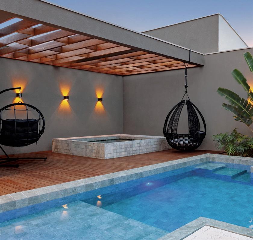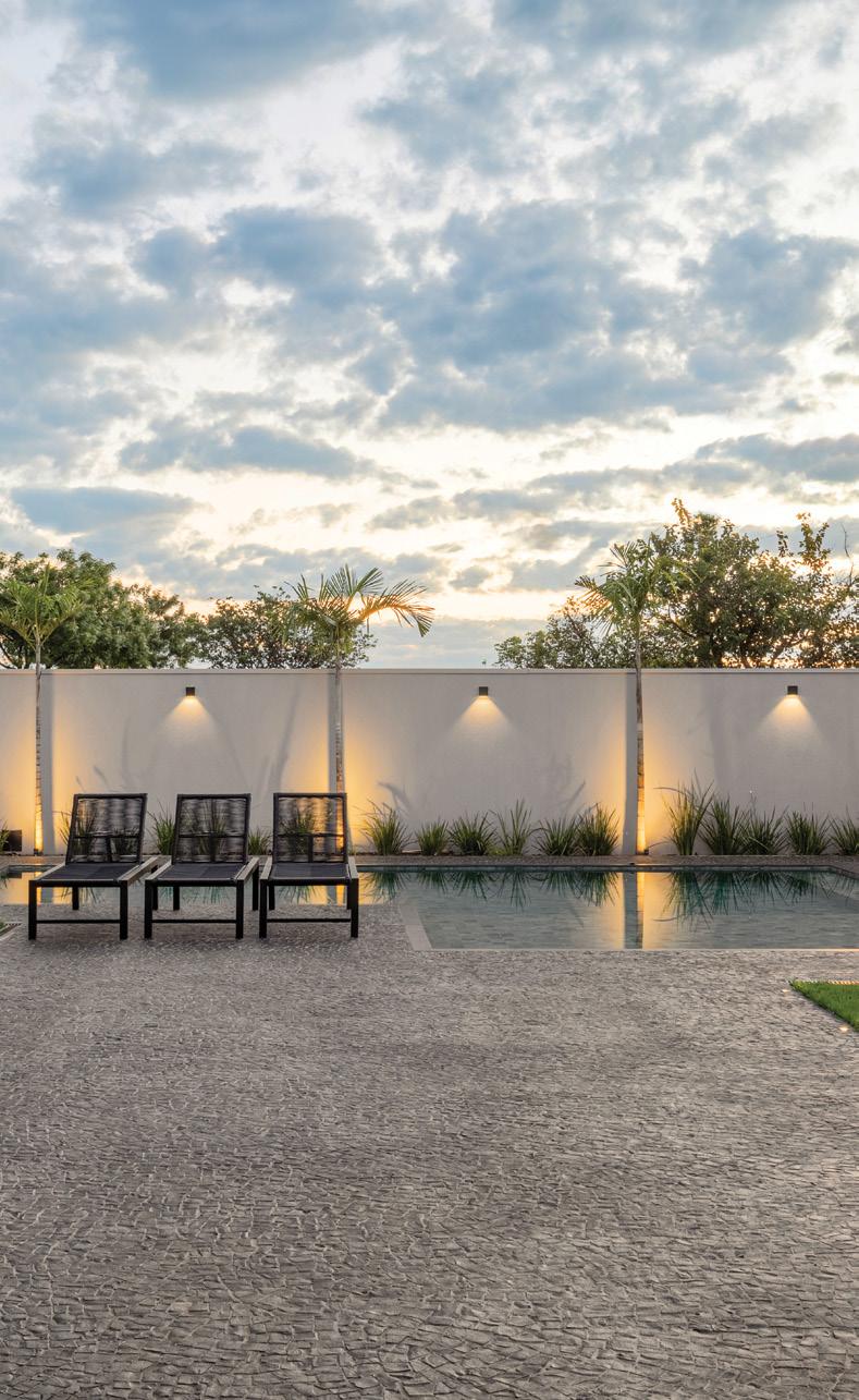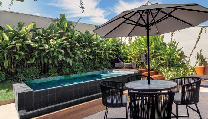 A piscina está estrategicamente localizada, integrando-se a todos os ambientes sociais. Internamente e nas bordas, foi revestida com porcelanato Barlavento e piso Araucária Clara, ambos da Portobello. As máquinas e equipamentos são da Trevizan Casa. O mobiliário externo convida à contemplação do jardim (Locatelli Plantas), que acompanha todo o muro com textura da Estoque Tintas. A área de SPA é ideal para relaxamento