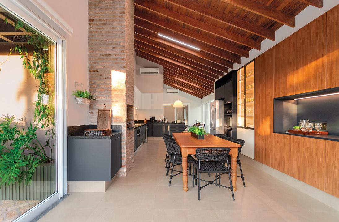 Acima, a primeira foto traz a integração da cozinha com a sala de jantar, com piso Beige Versalles da Portobello Shop Araçatuba. O gesso (Gesso Casa) recebeu ar condicionado embutido e coifa suspensa (Rancho’s Grill). A marcenaria foi executada pela Construart Móveis Planejados, inclusive no espaço gourmet, na segunda foto. Nele, o frontão da pia foi revestido com Gouache Brugnon em tom terroso e volume revestido em Steel Corten (ambos da Portobello Shop Araçatuba), com churrasqueira da Rancho’s Grill. As paredes são neutras, com tintas da Estoque Tintas