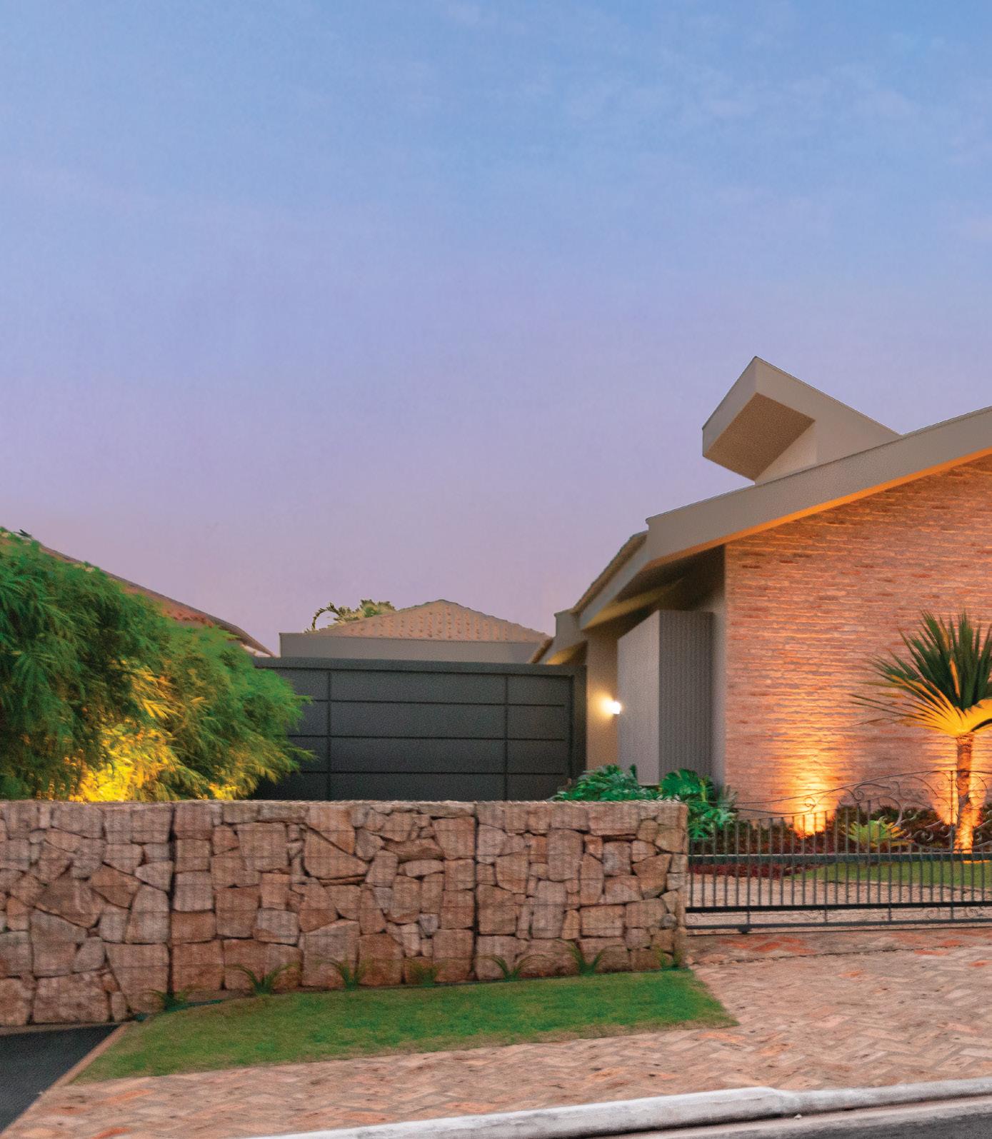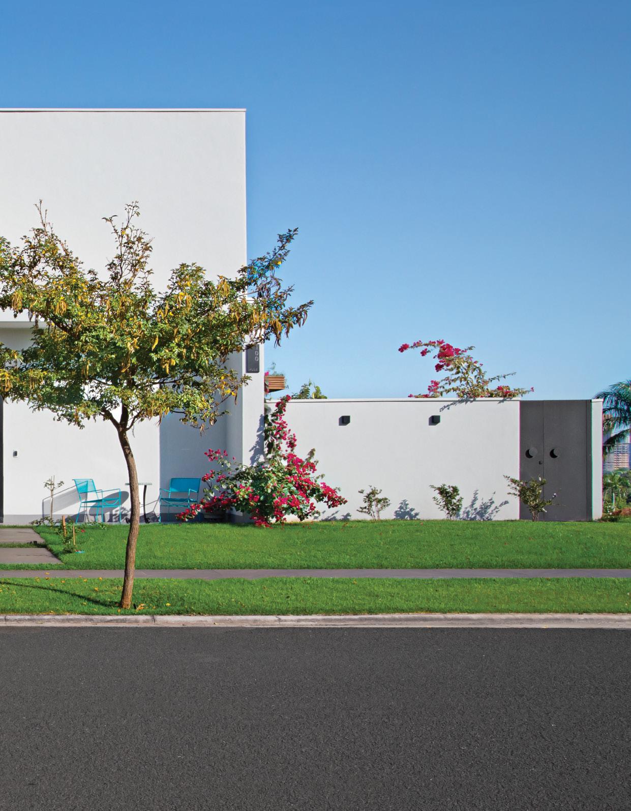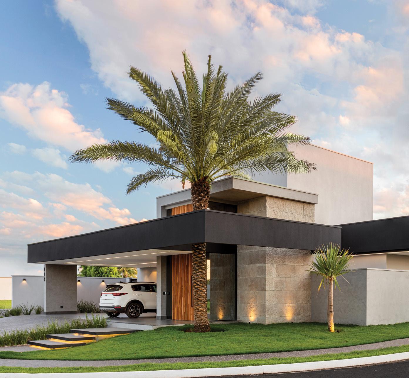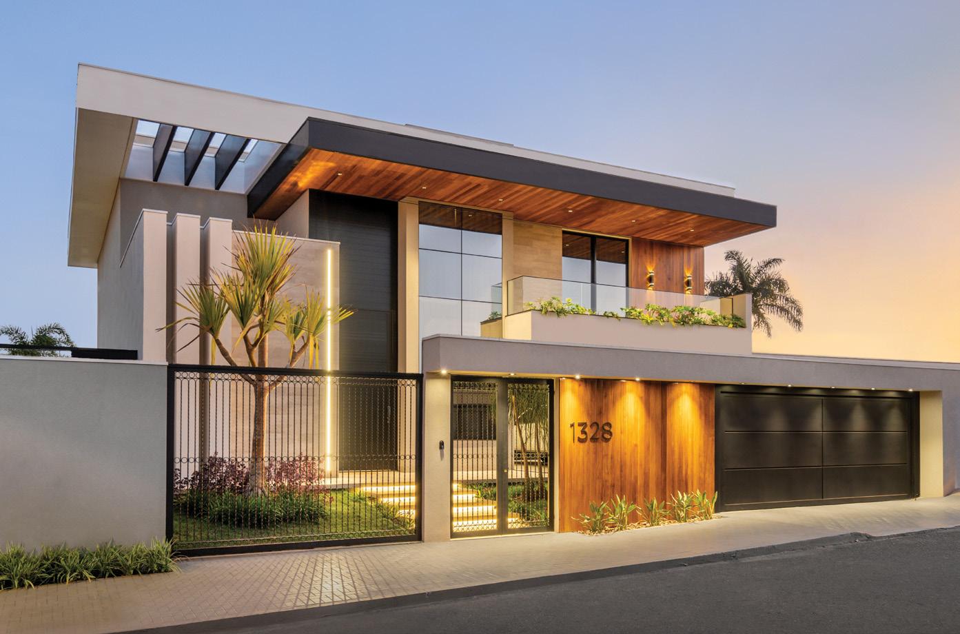 Mesmo voltada à rua, a fachada destacase pelas linhas modernas e materiais sofisticados, garantindo uma estética atemporal, mas ao mesmo tempo proporciona privacidade aos moradores com as janelas e demais aberturas (Project Alum) estrategicamente posicionadas. Em um amplo terreno, o jardim combina com as texturas amadeiradas presentes tanto no muro e varanda, quanto no forro. Entre as texturas estão o revestimento Brasília, da Portobello Shop Araçatuba, que remete ao concreto, além de ripas de pedras da Dourado Pedras. A iluminação da Rara Luce Iluminação complementa o projeto, destacando as texturas e volumes da fachada