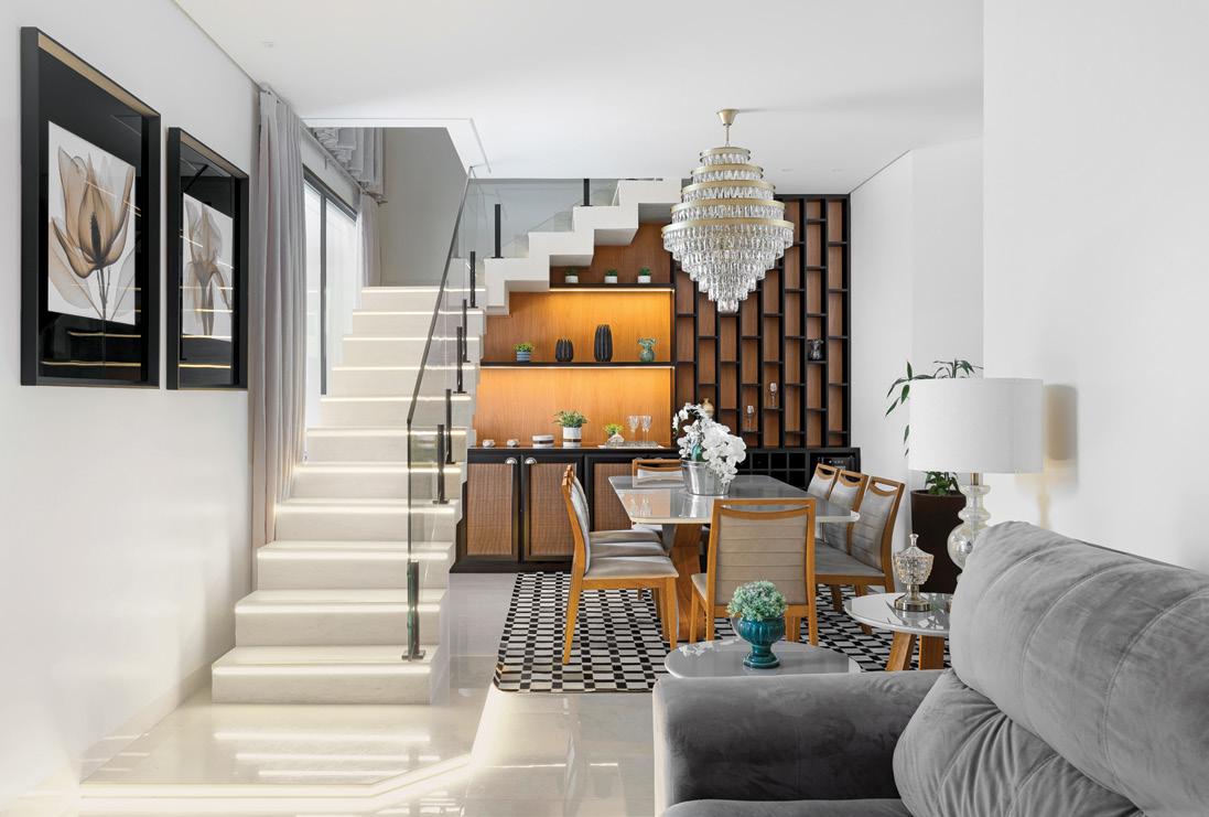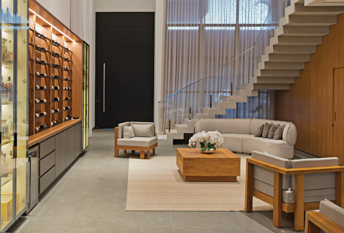 Abaixo, a porta de entrada dá acesso ao living, que recebeu um decor clean, com móveis atemporais e cortina do piso ao teto (A|Garcia Decor - Andréia Garcia). Para dar acesso à ala íntima, a escada foi revestida em mármore Branco Paraná (Marmoraria Vitória Prime) e ganhou guardacorpo em vidro. Além disso, o espaço tem adega sob medida, e painel amadeirado (Rodrigues Marcenaria e Decoração) nas paredes