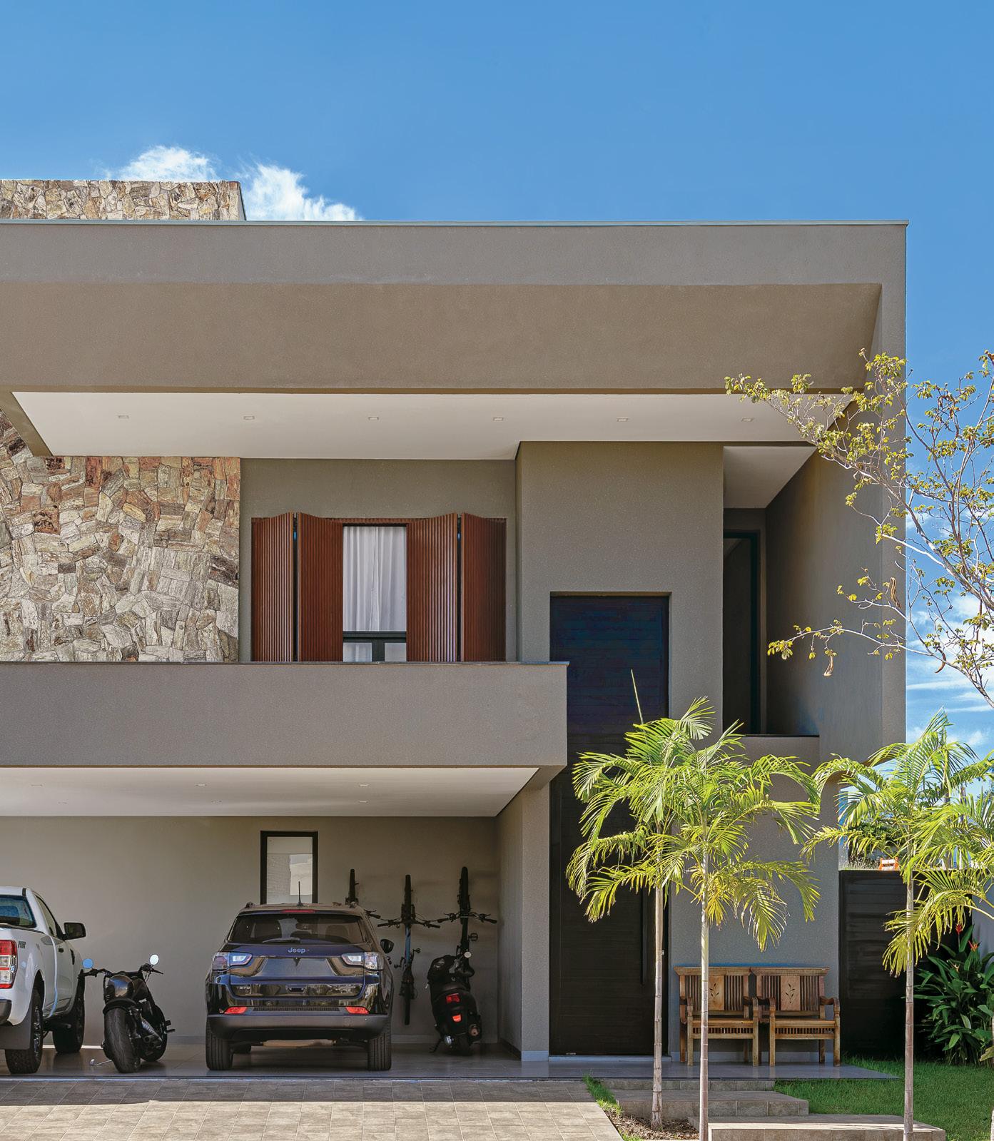 Na fachada, a escolha foi por dois tons de textura Lamato (Estoque Tintas), harmonizados com pedras Moledo nas paredes. O piso em porcelanato complementa o paisagismo da Locatelli Plantas. Ao lado, a varanda gourmet foi pensada para receber com conforto, por isso, uma marcenaria sob medida (GR Móveis Planejados) e uma generosa ilha em quartzito Kalahari, o mesmo material da bancada foram criadas. A churrasqueira elétrica, chopeira, cervejeira e lava-louças são da Casaconceito. A coifa da churrasqueira é da Coifas e Coifas. Na escolha dos acabamentos, revestimentos no formato espinha de peixe no frontão, da Portobello, com efeito ripado na churrasqueira e na base da bancada, tudo Casa dos Construtores, assim como o piso de porcelanato e os metais