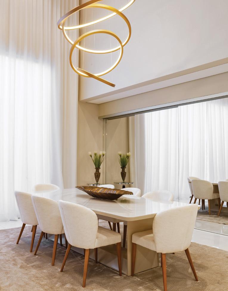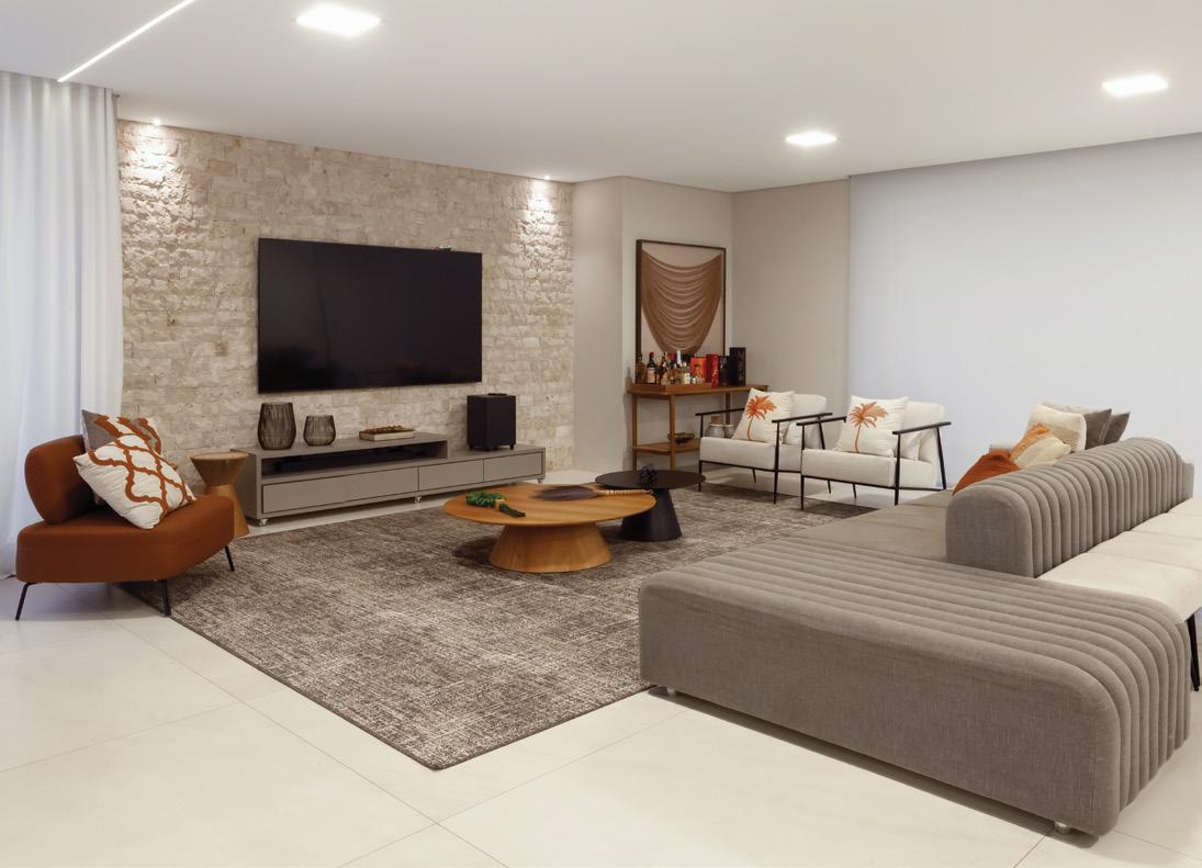 Acima, a sala de TV e jantar são integradas por um móvel de marcenaria que percorre toda a extensão, conectando os ambientes. Esse móvel inclui uma porta camuflada que dá acesso a áreas mais restritas da casa. O piso de porcelanato Ms. Barcelona Portobello serve como base para o tapete, sofá, mesa e cadeiras de jantar. O forro de gesso com iluminação, destaca as paredes neutras (Estoque Tintas) e revestimentos Filó Greige Natural da Portobello, enquanto cortinas de tecido finalizam as amplas aberturas (Atalumínio) que levam à área externa
