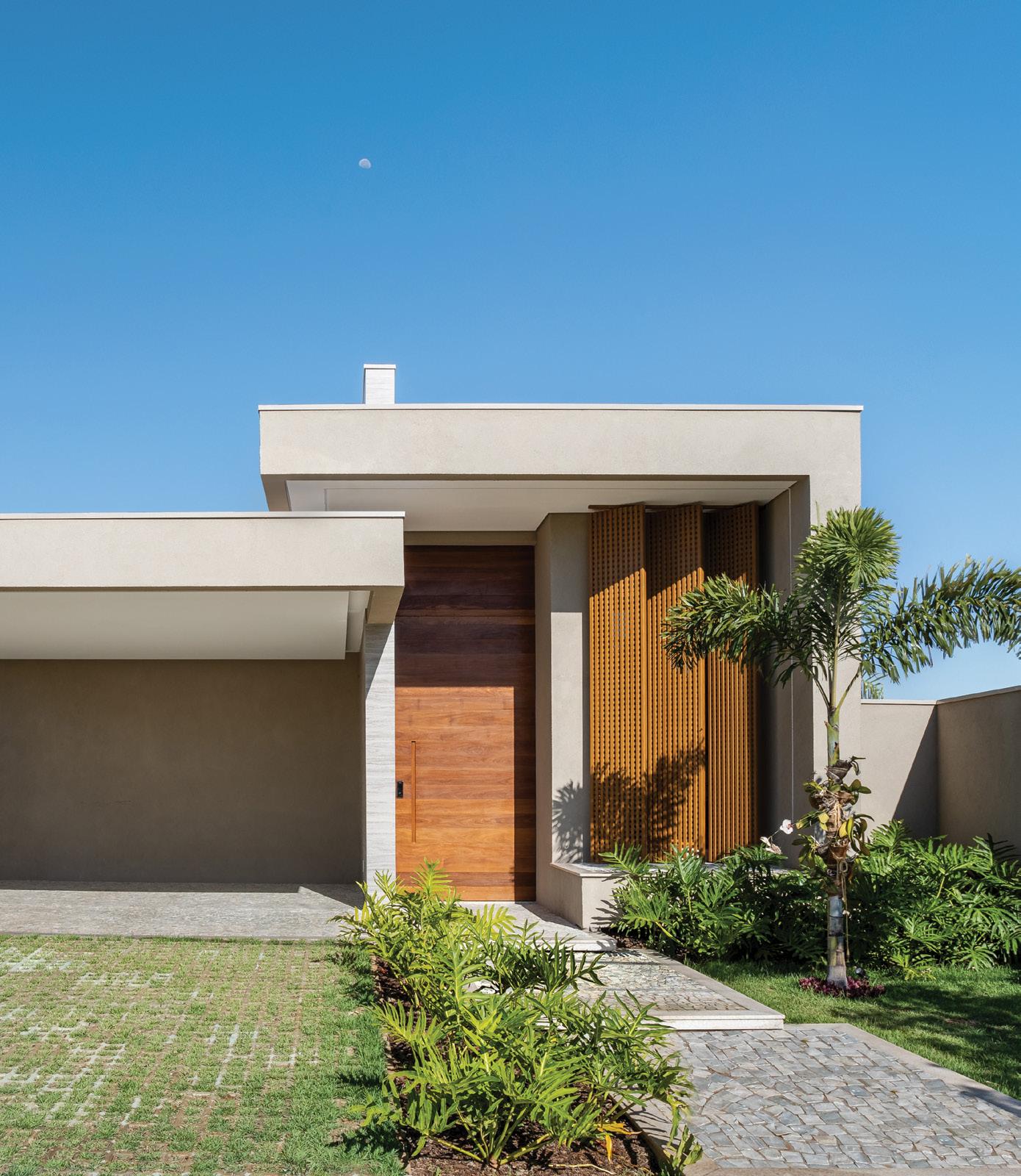 A fachada revela uma casa térrea contemporânea, com brise pivotante muxarabi em alumínio amadeirado (Atalumínio) que oferece privacidade à janela do escritório, ao mesmo tempo permitindo iluminação e ventilação. A porta de entrada acentua a altura do pé-direito e contrasta a textura amadeirada com os tons de cinza das tintas (Estoque Tintas) e do revestimento Filó Greige Natural da Portobello. O projeto tem paisagismo da Locatelli Plantas, destacado pela iluminação que completa o visual