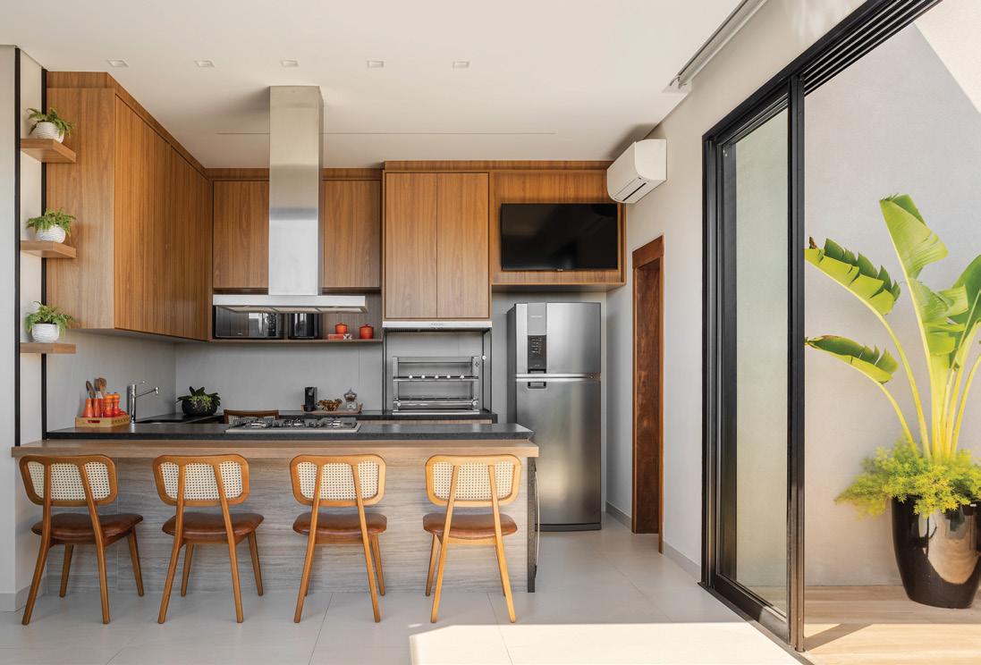 O espaço gourmet contrasta as texturas amadeiradas da marcenaria sob medida (Rodrigues Marcenaria e Decoração) com os tons sóbrios dos móveis. O granito São Gabriel (Marmoraria Vitória Prime) foi a escolha para revestir a ilha e a bancada da pia. O ambiente é equipado com chopeira, churrasqueira e coifa, tudo da Coifas & Coifas e tem iluminação da Dimenluz Iluminação