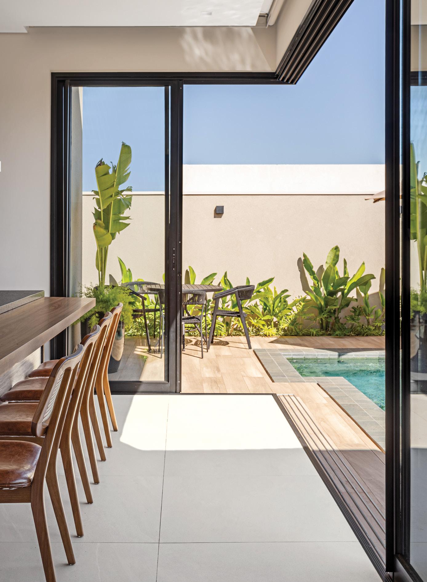 As aberturas são dispostas ao longo da casa, permitindo a contemplação do jardim. Na área externa, ao lado, a piscina tem revestimento interno da Decortiles Ator Jade e borda em porcelanato. As máquinas e equipamentos são da Birigui Piscinas
