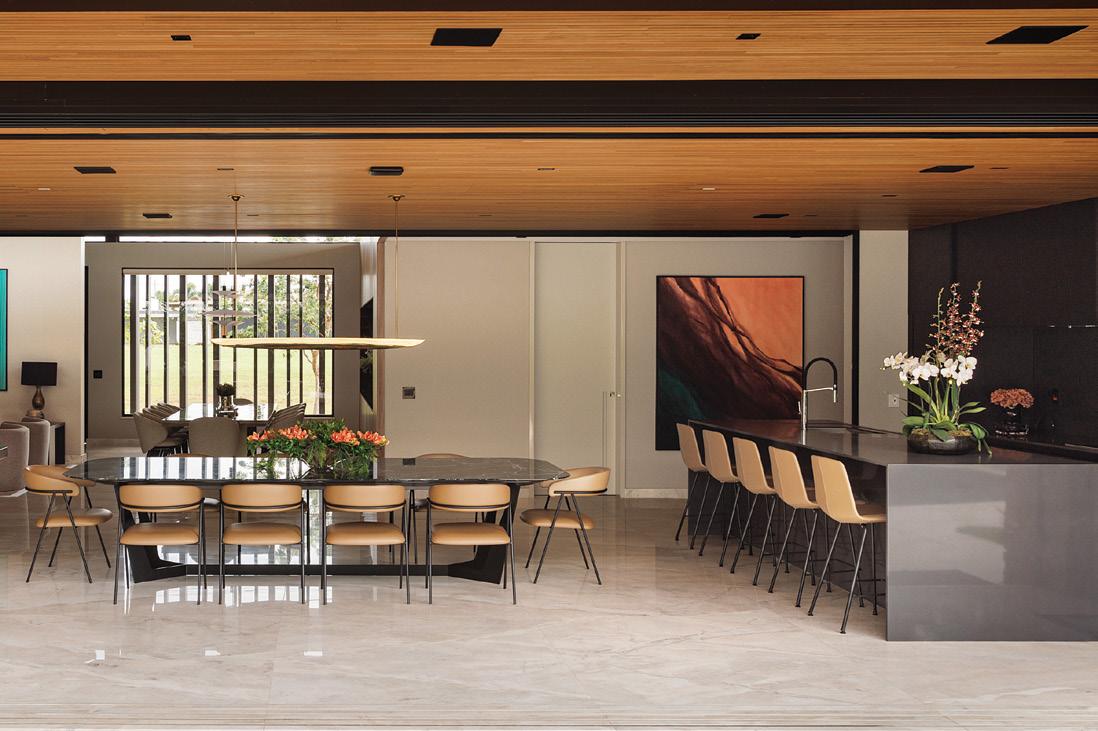 Acima, a integração da área social e de lazer com ambientes distribuídos em um mesmo plano, conectando-se diretamente com o espaço externo. O piso interno é todo em mármore Calacata Machiaoro (Marmoraria Design), e o forro amadeirado acentua a sensação de aconchego. A parede em pedra natural se estende até a fachada, e as esquadrias reforçam a unificação. Uma generosa ilha em mármore (Marmoraria Design) incentiva o convívio social, que compõe com o mobiliário contemporâneo. A marcenaria em tom grafite, ganhou metais da Docol (Portobello Shop Araçatuba), além de coifa da Coifas & Coifas
