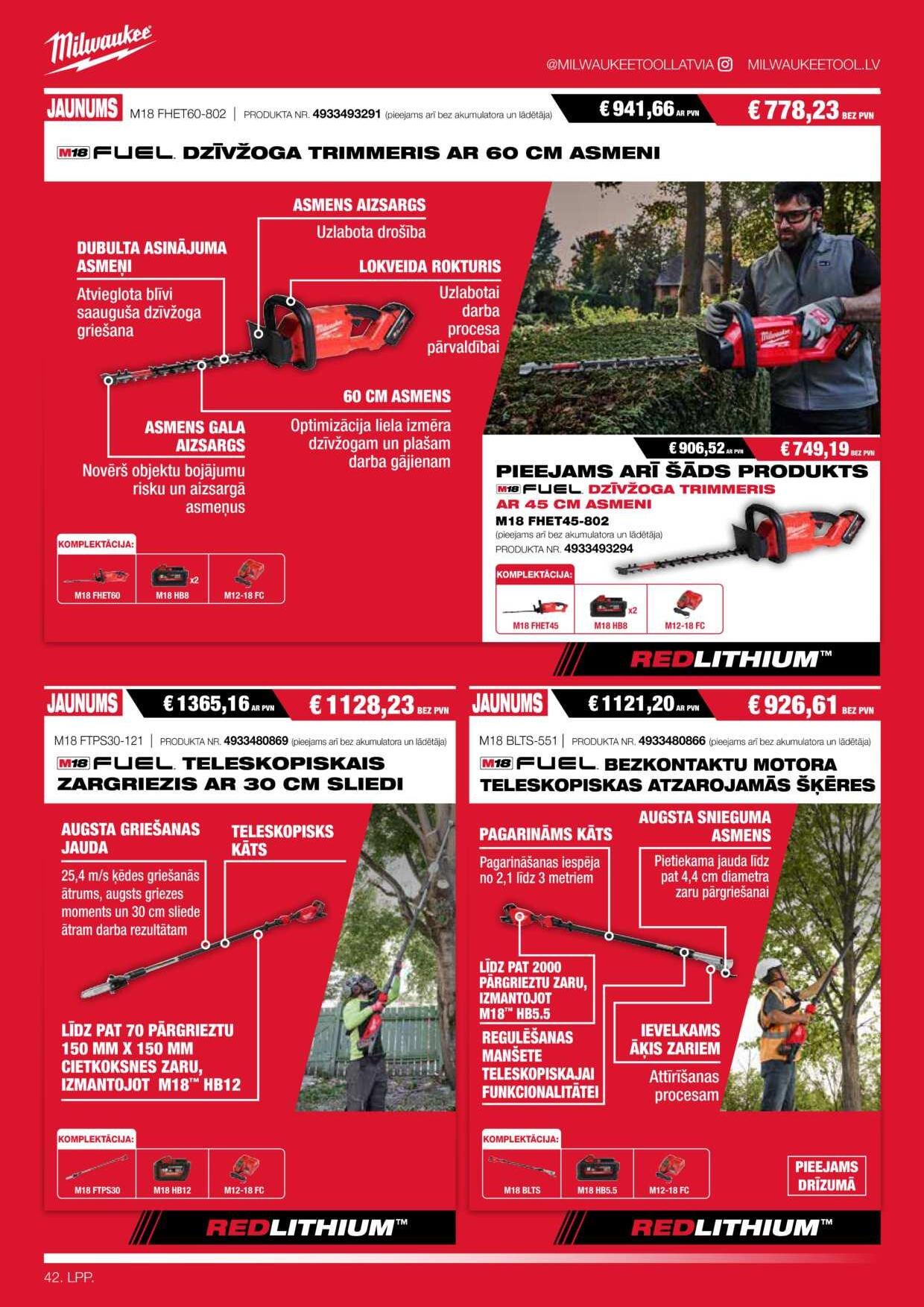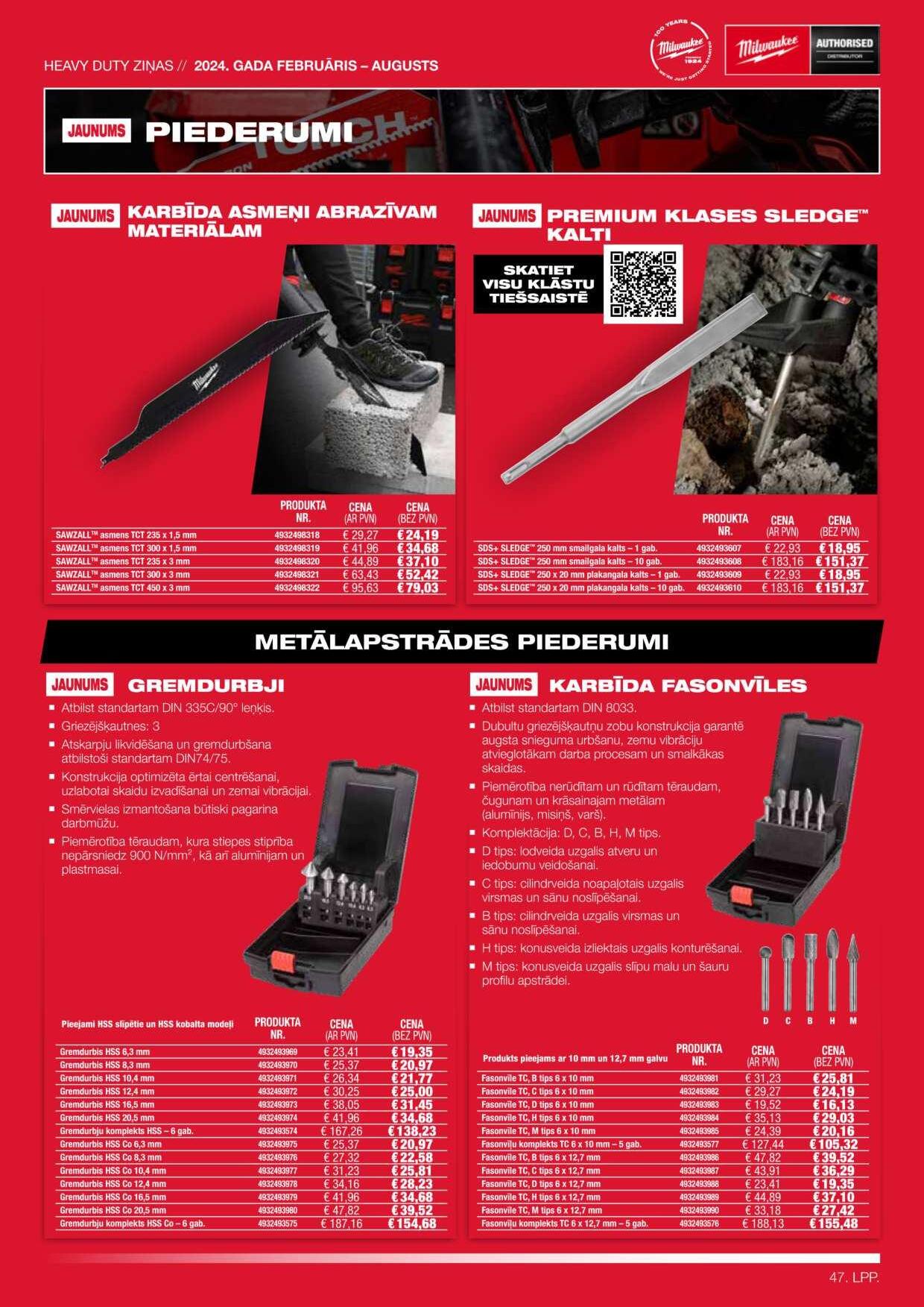 10. LPP. @MILWAUKEETOOLLATVIA MILWAUKEETOOL.LV IZCILI RISINĀJUMI 5 NOZARĒM 100 4933478450 € 857,73 AR PVN € 708,87 BEZ PVN M18 FMTIW2F12-502X 4932472003 € 56,20 AR PVN € 46,45 BEZ PVN TRĪSPLAKŅU ROKTURA SKRŪVGRIEŽU KOMPLEKTS NR. 4 – 12 GAB. 4932464945 € 142,47 AR PVN € 117,74 BEZ PVN 3/8 COLLAS METRISKĀS SPRŪDRATA ATSLĒGAS UN UZGAĻU KOMPLEKTS (32 GAB.) 4932471864 € 215,36 AR PVN € 177,98 BEZ PVN 1/2 COLLAS METRISKĀS SPRŪDRATA ATSLĒGAS UN UZGAĻU KOMPLEKTS 4932492773 € 96,61 AR PVN € 79,84 BEZ PVN 3 GAB. KNAIBĻU KOMPLEKTS