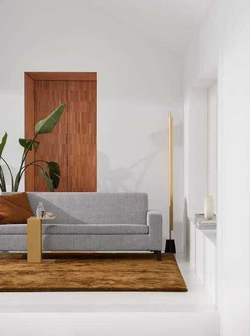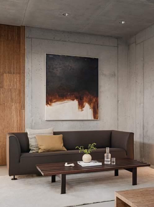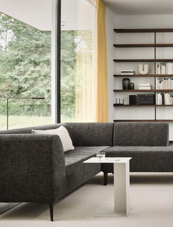The 10010 Prime was designed by Studio Truly Truly in 2020. The sofa is comfortable, and its thick, almost voluptuous seat makes it look soft yet architectural. The arm cushions hang just slightly over the edge of the slender base, giving the design character.