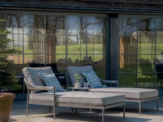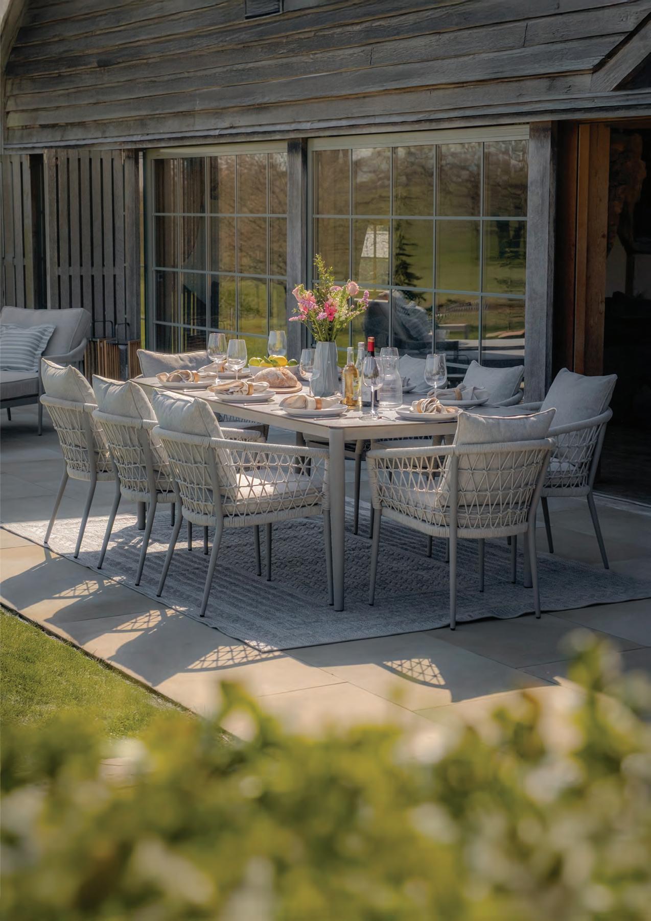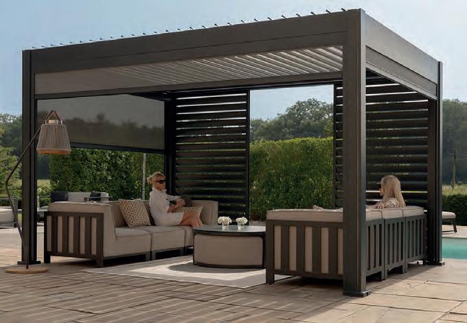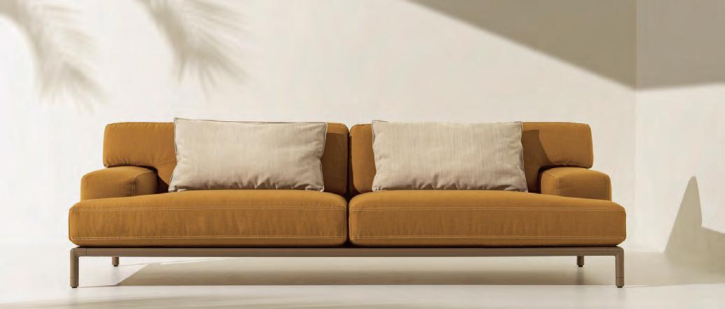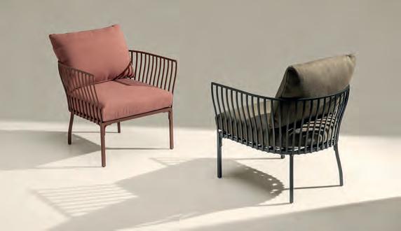 The suspended structure in tubular aluminium with bright polished finish of Ethimo’s Lodge by Christophe Pillet holds generous cushions in colours inspired by the vibrant hues of the savannah, and includes sofas, armchairs, daybeds, poufs and a coffee table with a marble top