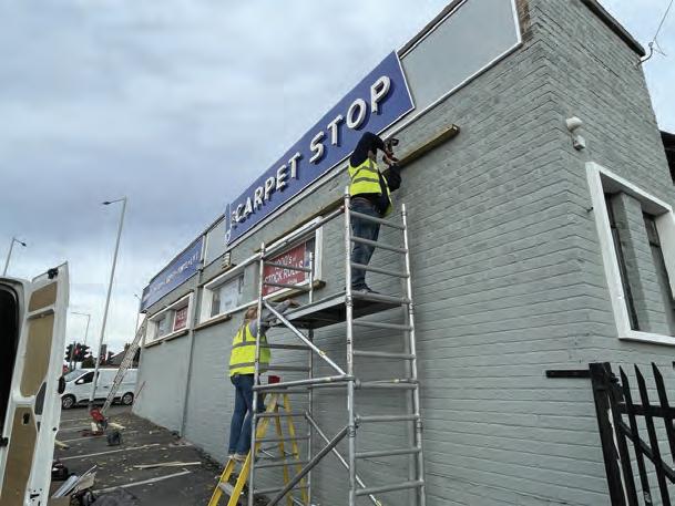 framed in milled aluminium. The fascia sign also had a 6m trough light. The project was extended to include a lower, 14m-wide sign to cover drains and windows, featuring a combination of flooring types but mainly Amtico and Karndean.