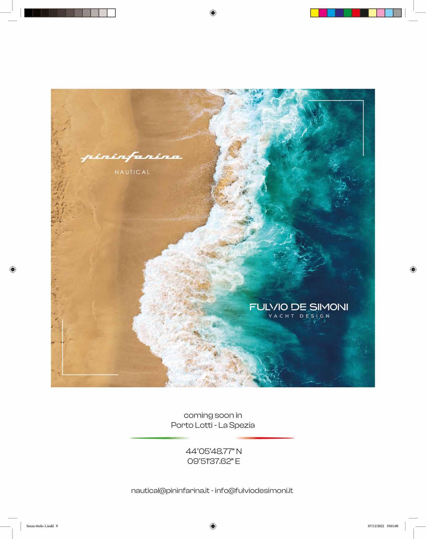 La ricchezza di segni, l’alternanza dei volumi, l’uso del colore, il contrasto tra chiari e scuri tutti elementi distonici probabilmente figli della complessit e della poca serenit che il mondo sta vivendo. Il fatto che l armatore di questa barca abbia gi deciso di venderla un chiaro indicatore che il mercato non perdona i brutti progetti. Il successo deriva dal lungo processo di distilla ione di elementi che trovano il giusto equilibrio. a scuola italiana di design nautico ha visto nascere e sbocciare talenti divenuti simboli indiscussi del settore a livello interna ionale. n altra caratteristica tutta italiana riguarda l artigianalit che ha saputo sposare l innova ione. Investimenti e ricerca sono un punto fermo nella mission dei nostri cantieri nautici e delle aziende della componentistica navale che hanno ottenuto standard sempre maggiori non dimenticando fattori come la sostenibilit e l impatto ambientale. rendiamo a prestito le parole di runo espa contenute nel suo interessante libro La grande tempesta, edito da Mondadori per Rai Libri: “La storia italiana è fatta da un popolo più intelligente e fantasioso della media europea, con tratti frequenti di genialità. Ma, al contrario degli altri paesi europei, l’Italia si è rinchiusa in una gabbia di norme, vincoli, ine cien e, dispetti burocratici, paralisi giuridic e, assurdit ambientali, corru ione ed evasione fiscale fuori norma, c e non le anno fatto muovere un passo negli ultimi trent’anni”. Fortunatamente l’industria nautica italiana, nonostante i suoi politici gra ie a quel tratto di genialit che ci contraddistingue e a uno sfor o immane posi iona l Italia al primo posto nel mercato nautico globali ato. oi sappiamo produrre belle a e innova ione ma dobbiamo cercare di non dimenticare la lezione dei maestri del design italiano che hanno sempre coniugato il bello con il fun ionale.