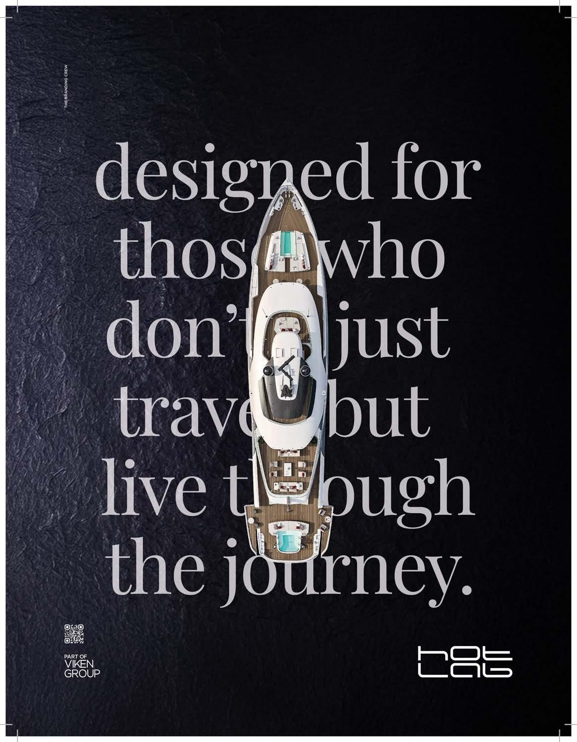 Year 2024, Cruising Speed: 10 kn, Maximum Speed: 12.7 kn, Beam: 22’ 8’’, Max Draft: 6’ 11’’, Displacement: 363,763 lb, Fuel Tank: 1 x 16380|liter, Fresh Water: 1 x 6100|liter. abins: 6, Heads: 7. €5,150,000. u Denison Yachting sales@denisonyachting.com www.denisonyachtsales.com