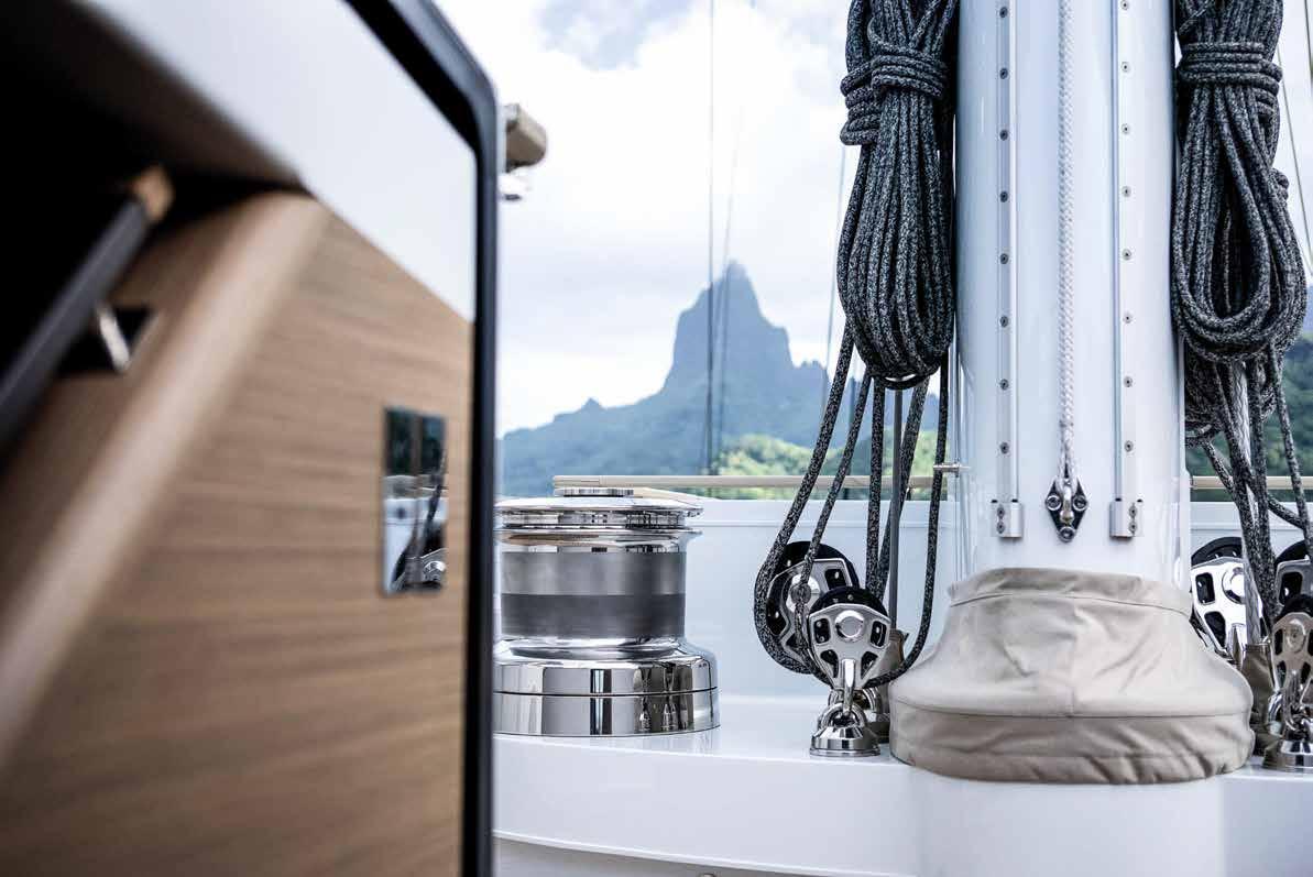 2012: due cabine più equipaggio, randa, fiocco, trinchetta avvolgibili, passerella e spiaggetta di poppa idrauliche, dissalatore, generatore.