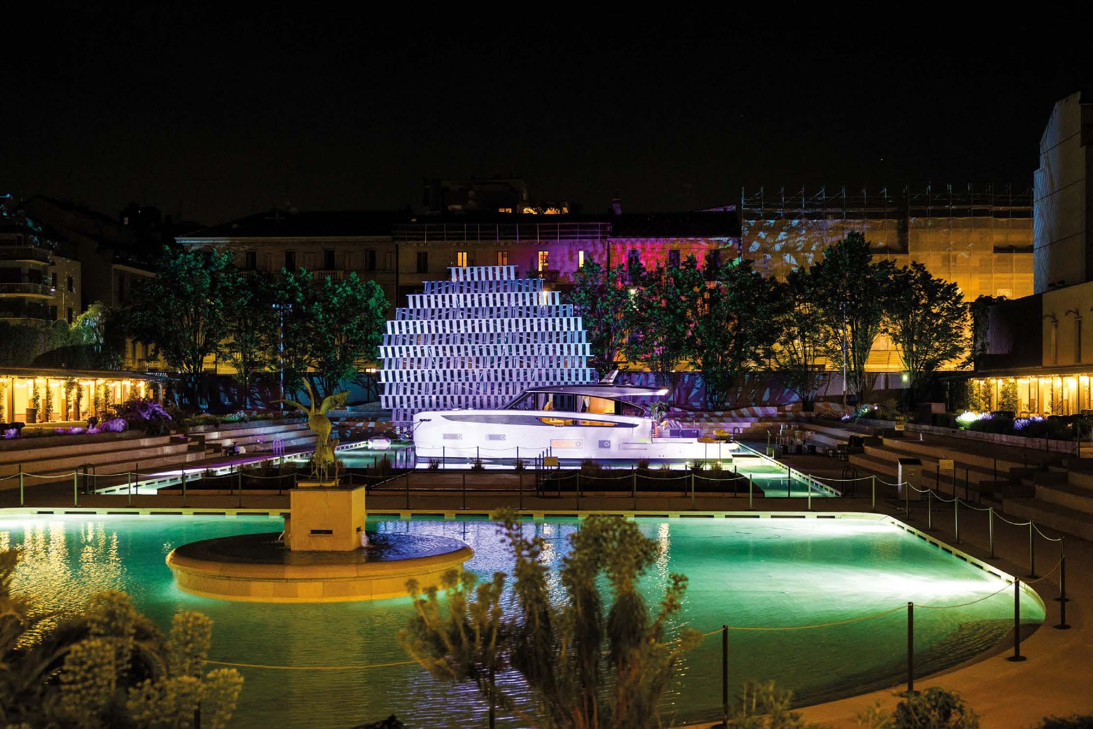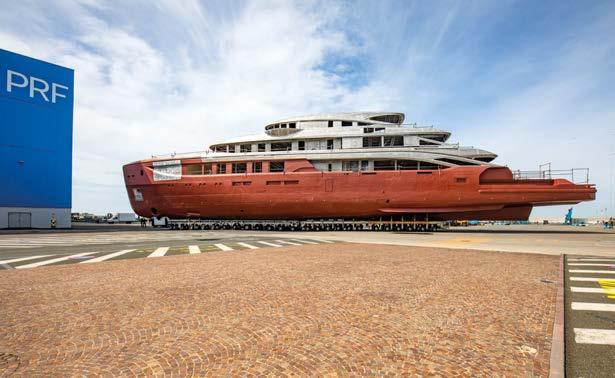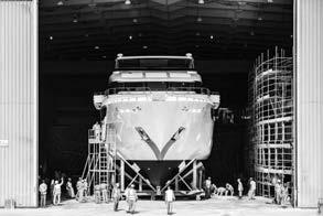 THE 66-METRE ISA SPORTIVA, UNDER CONSTRUCTION IN ANCONA, HAS ENTERED THE OUTFITTING PHASE. HER STEEL HULL AND ALUMINIUM SUPERSTRUCTURE HOST TWO ENGINES OF 2,560 KW EACH ALLOWING A MAXIMUM SPEED OF 18 KNOTS.