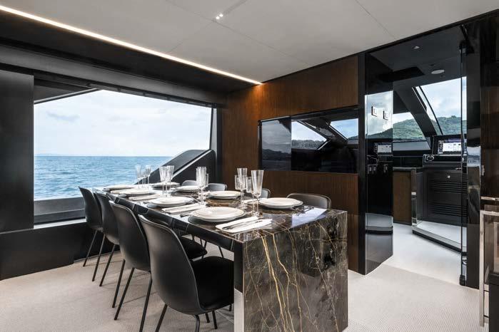 The carbon bre construction ensures e cellent speed and great autonomy. The hull, designed by the etestep studio, allows navigation at a ma imum speed of 43 knots.