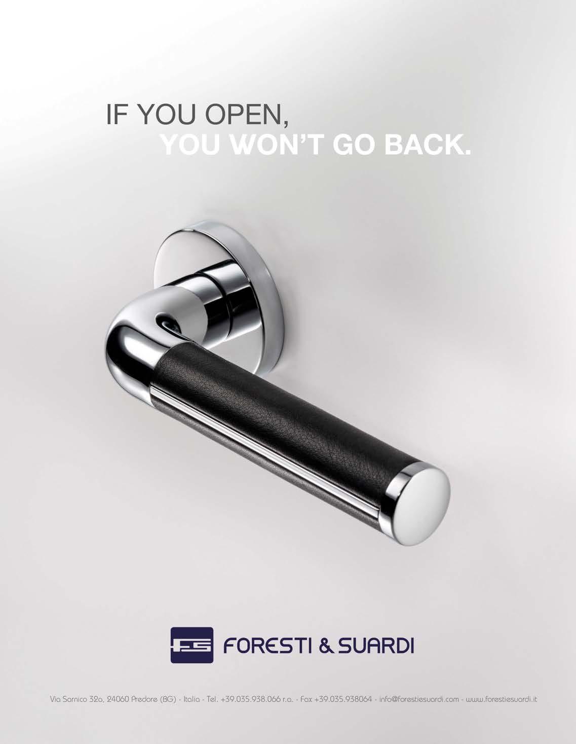 The new line of handles proposed by Foresti & Suardi has been conceived with characteristics of e ibility and e pandability of shapes and nishes. t includes numerous models with a square section in chrome-plated brass, more rounded versions, handles with an inner sheet of chrome-plated brass that remains visible and an outer cover in black leather or co ee colour.