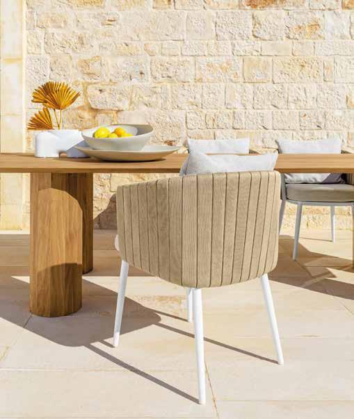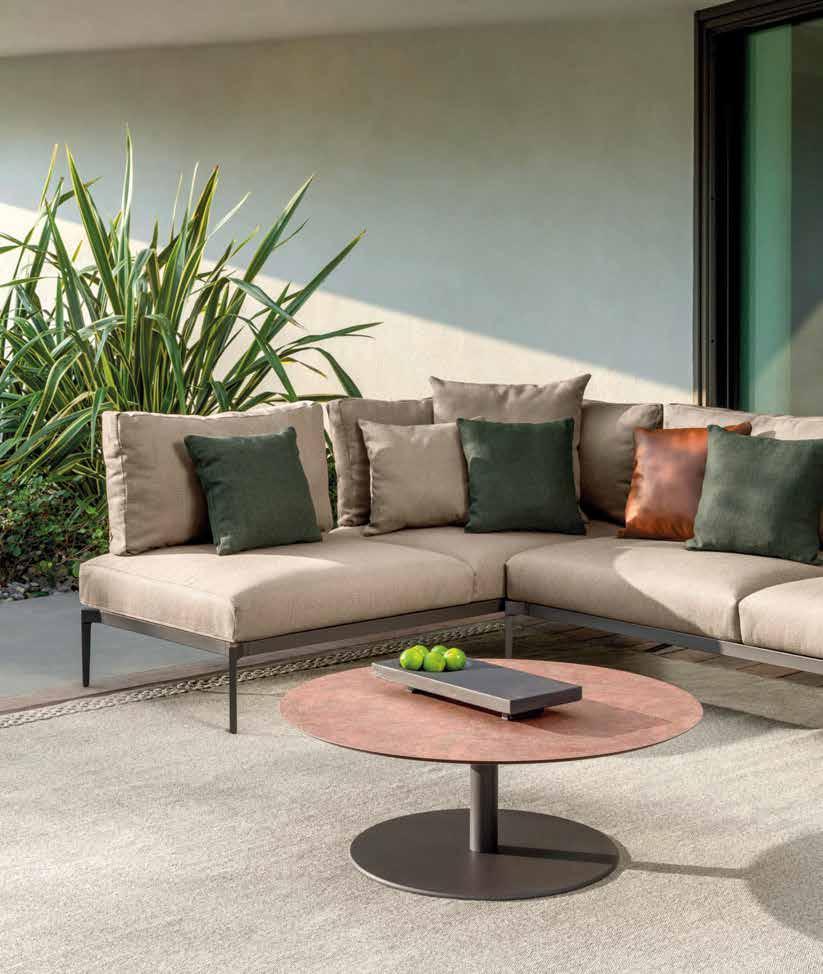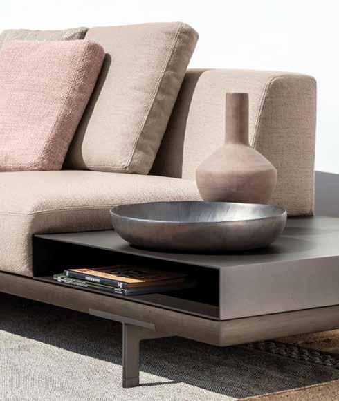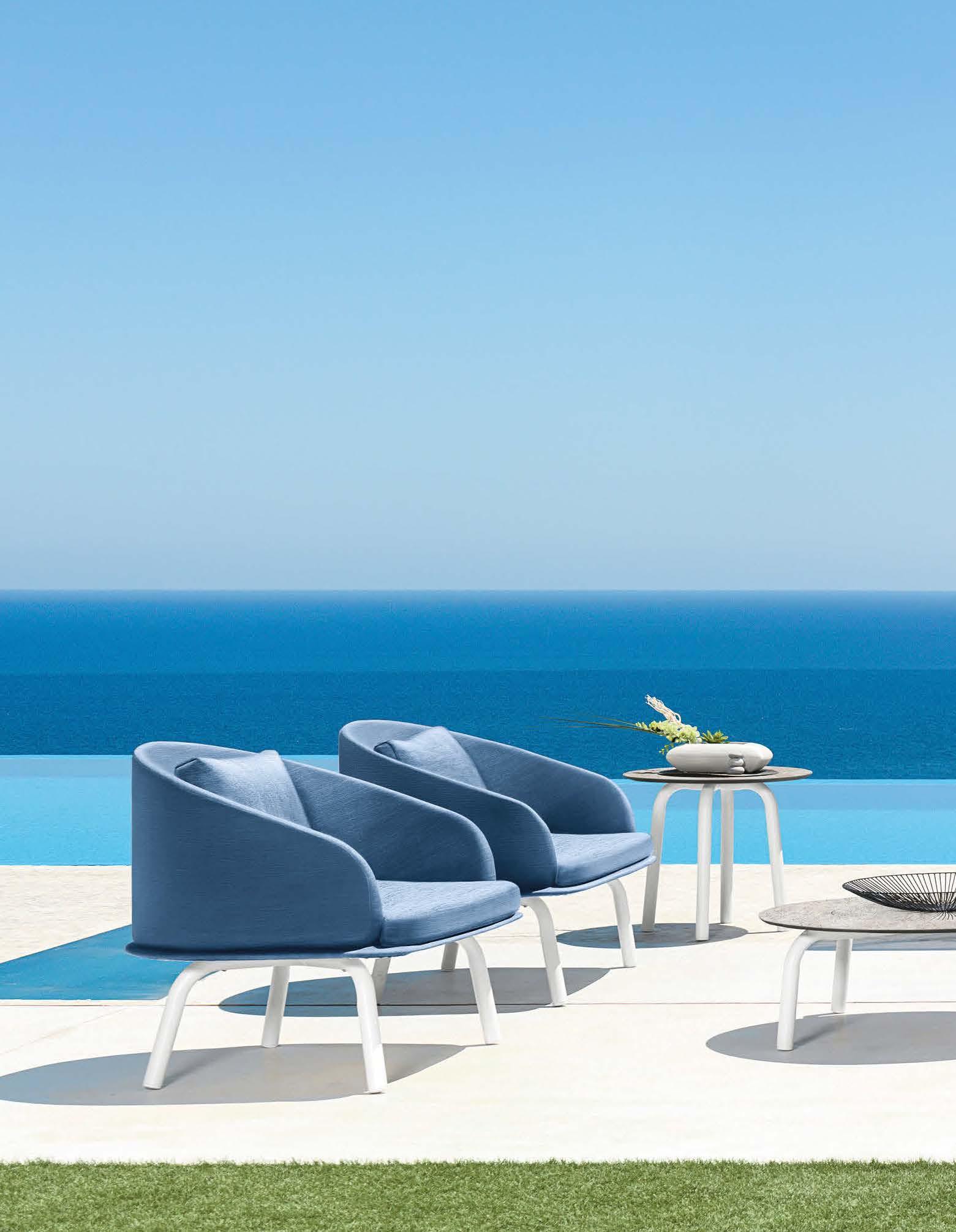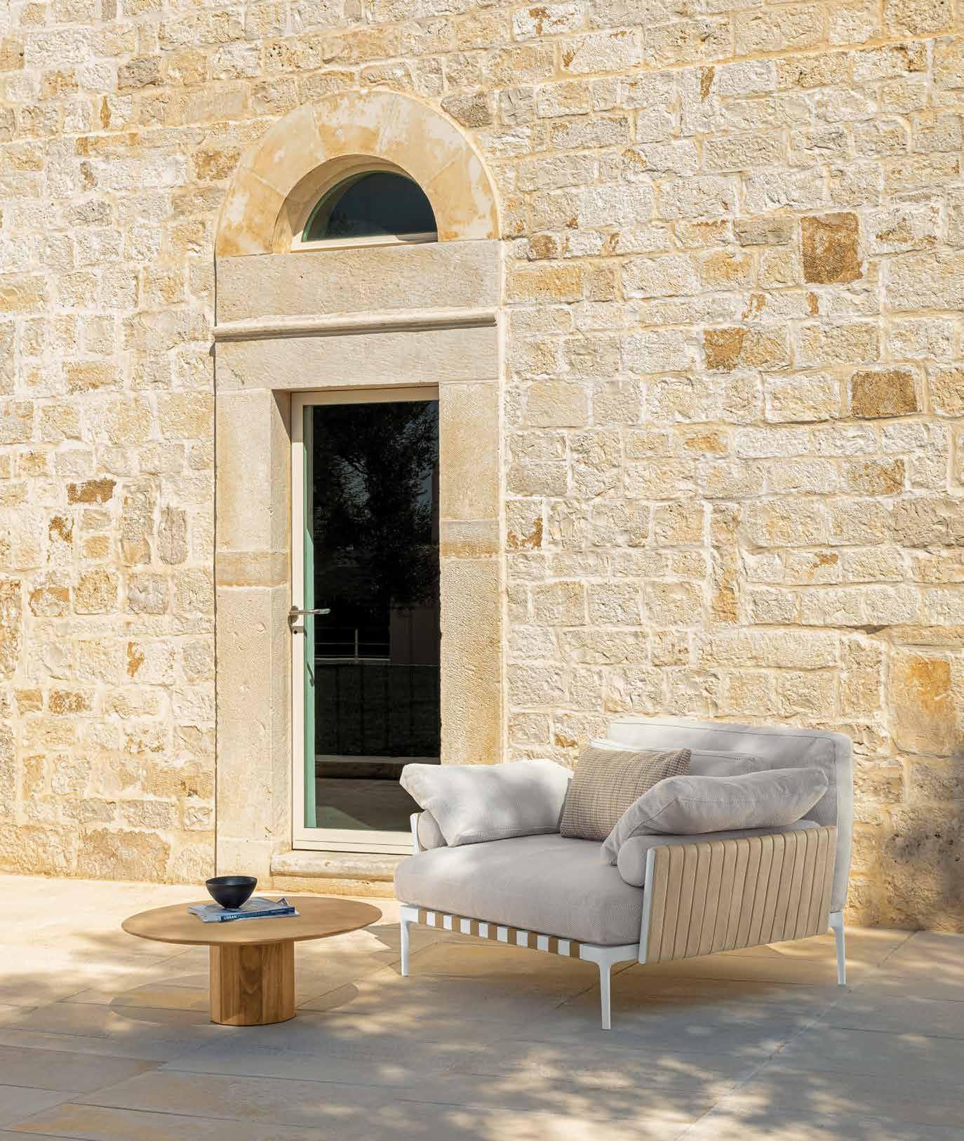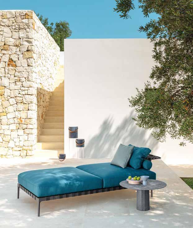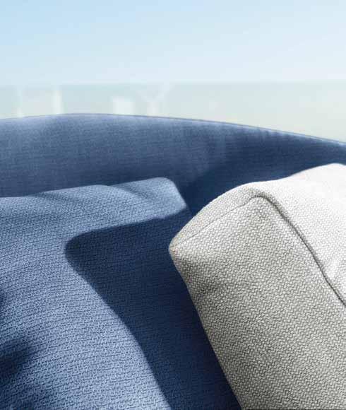 Harbour, designed by Francesco Rota for Paola Lenti, to furnish outdoor spaces, features a stainless steel AISI 304 structure att arnished in the colours i ory or raphite. ac and ar rest co erin s are in aris fabric. The re o able cushions are in polyester fibre and stress resistant polyurethane. The external upholstery is available in the Luz, Rope T, Brio, Thea and Wara fabrics.