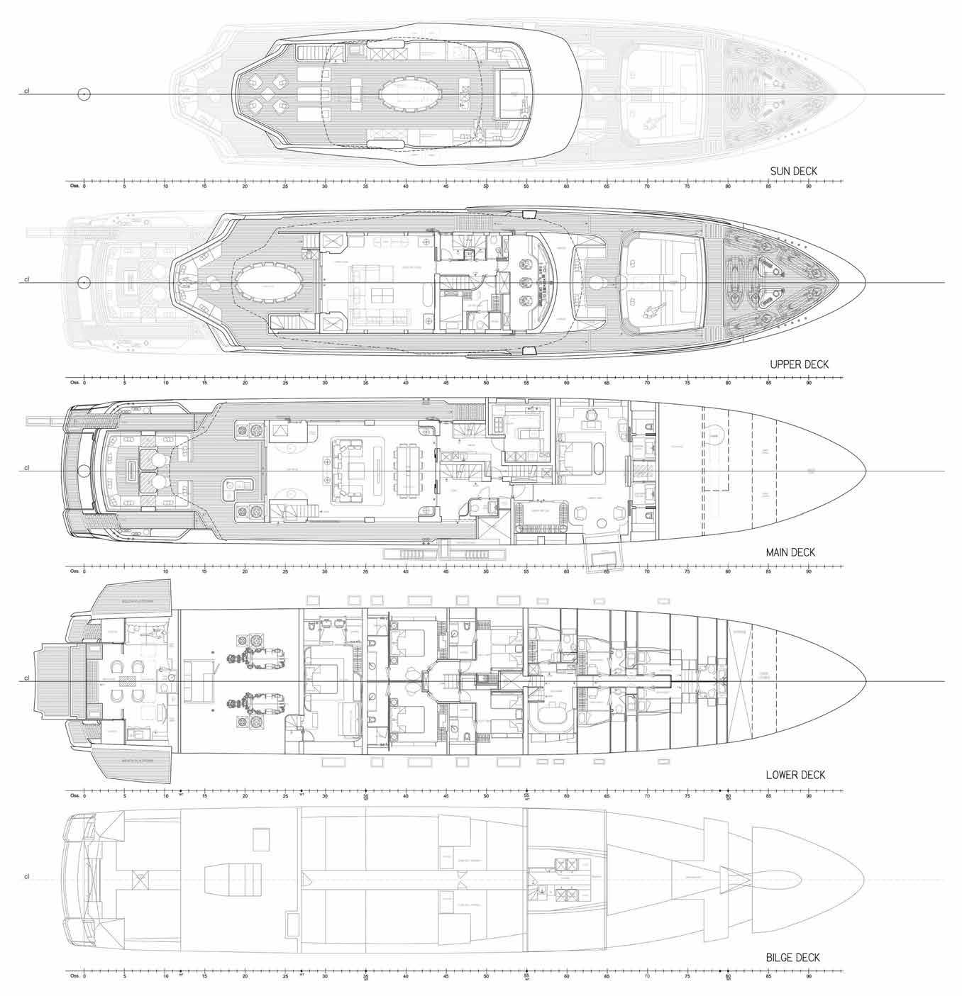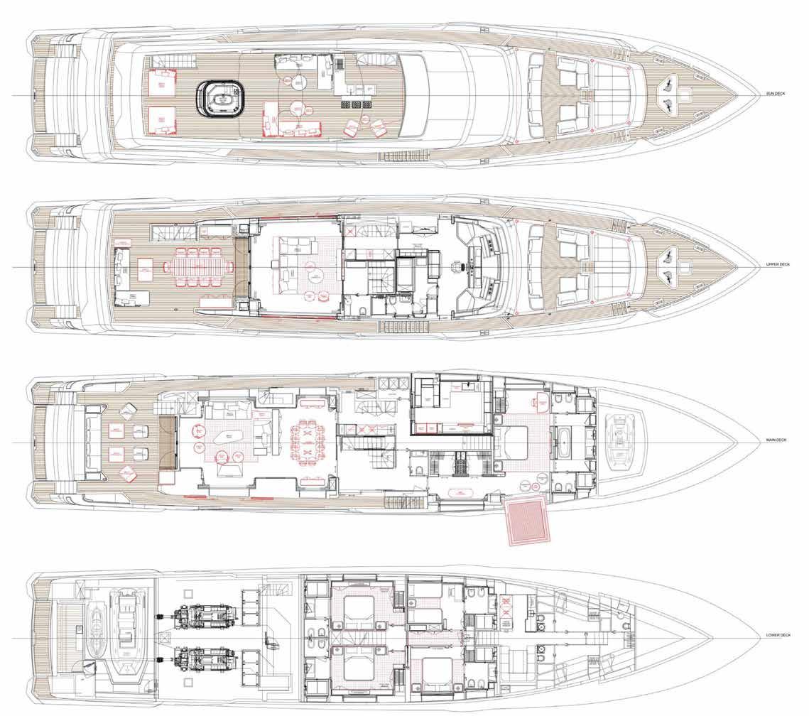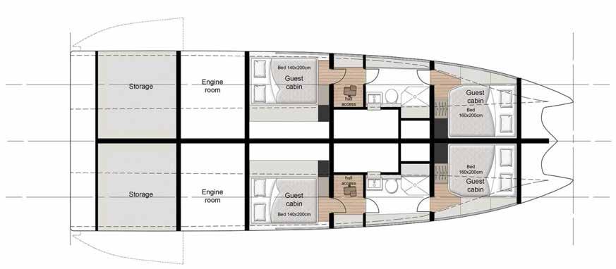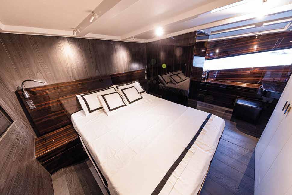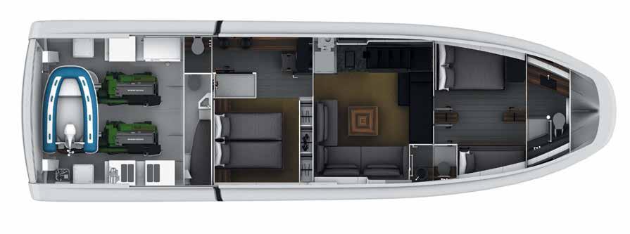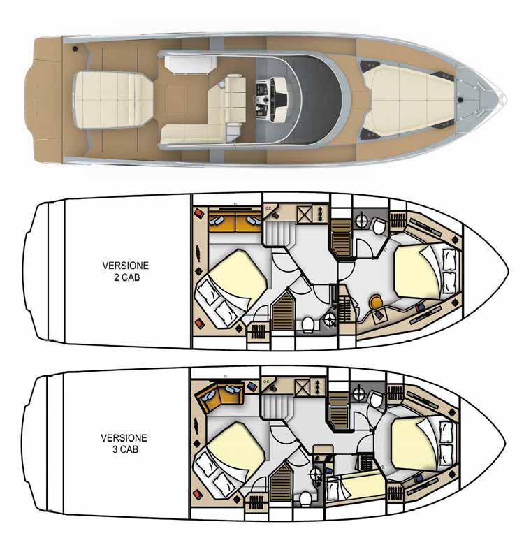 2012: due cabine più equipaggio, randa, fiocco, trinchetta avvolgibili, passerella e spiaggetta di poppa idrauliche, dissalatore, generatore.