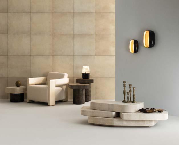 British designer Alexander Lamont drew inspiration for his creations from the ancient highlands and rocky terrain of the British landscape. The XXV Spring collection features pieces with precise colour and workmanship details, seemingly made from galuchat, parchment, or richly pigmented straw. The pieces resemble architectural remains or modern blocks, transformed into r ro e i e o r co ee t e armchairs, lamps, and wall lights.
