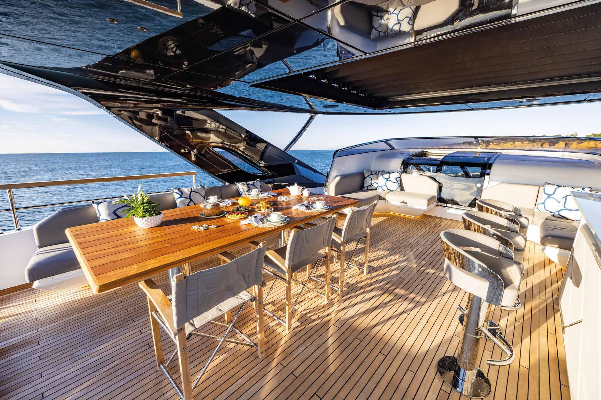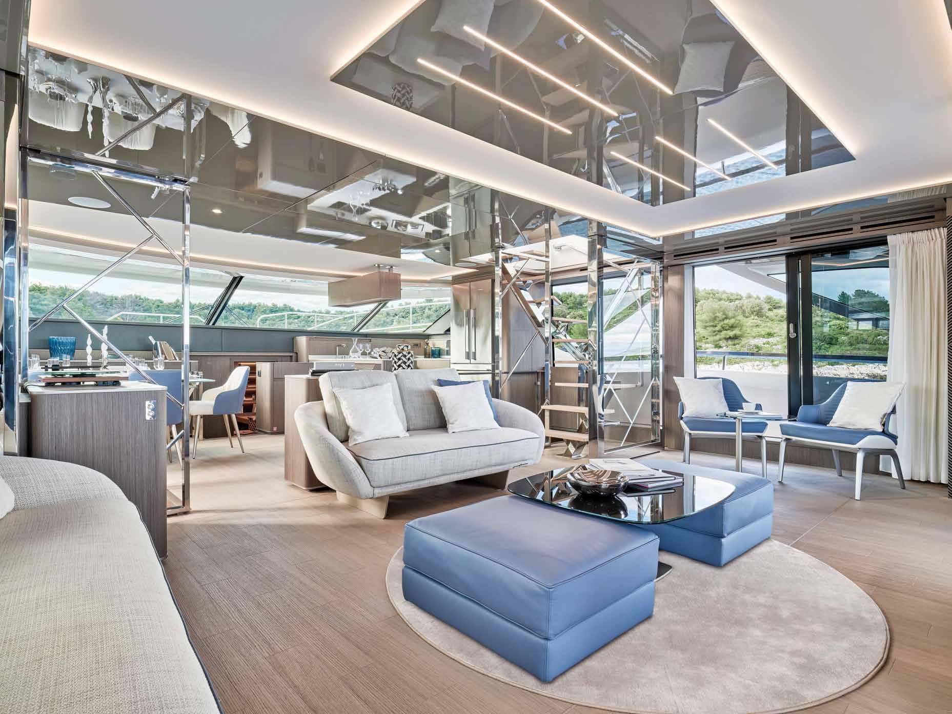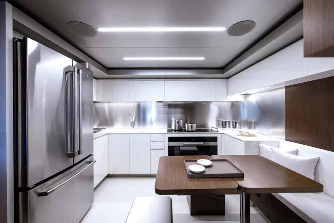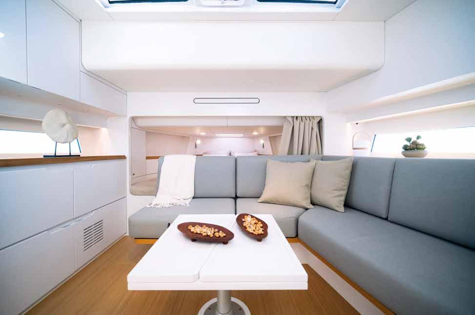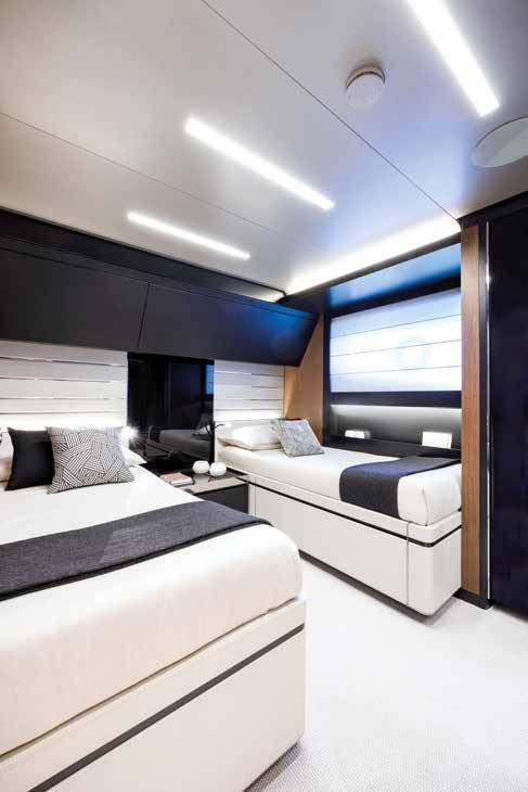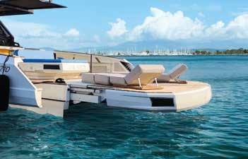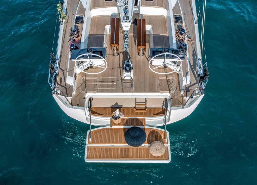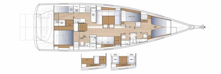 2012: due cabine più equipaggio, randa, fiocco, trinchetta avvolgibili, passerella e spiaggetta di poppa idrauliche, dissalatore, generatore.