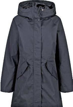 Naisten klassinen vedenpitävä parka jokapäiväiseen käyttöön. Takissa on kiinteä huppu, säädettävä vyötärö ja hihansuut. Edessä vetoketjulliset taskut.