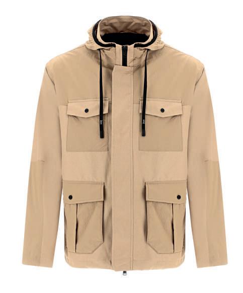Outerwear ranges from parkas with mesh elements to anorak hoodies, with white leather sneakers coordinated with trapezoid hand or shoulder bags for an essential final touch.
