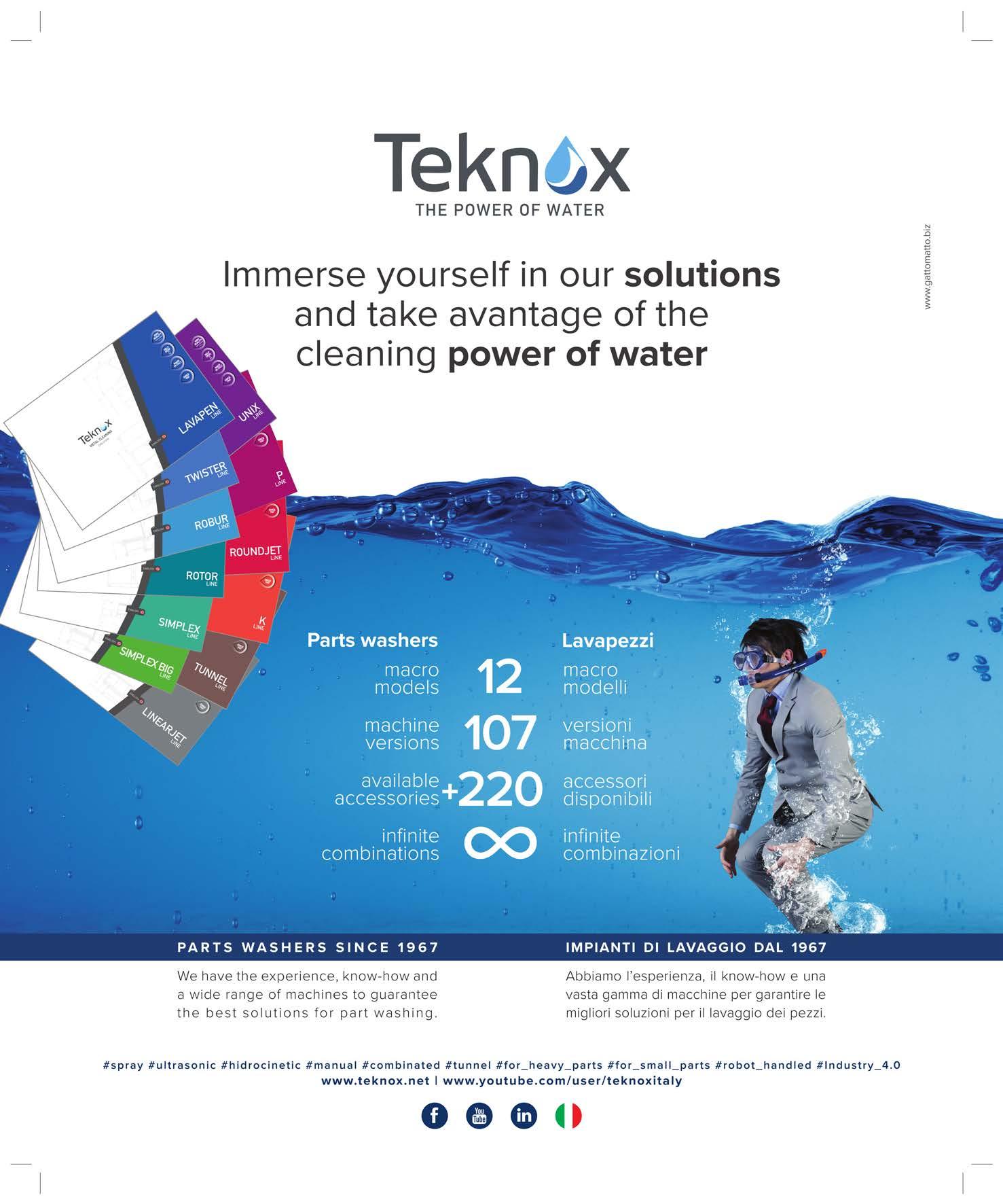 At the same time, sustainability is revolutionising traditional production methods. Reducing water and energy consumption, using lastgeneration solvents with less impact on health and the environment, and implementing waste water treatment and recirculation systems are now key issues in manufacturers’ specifications. Companies are being asked to reconcile seemingly conflicting requirements: on the one hand, ensuring ever-higher levels of cleanliness, and on the other, reducing the environmental footprint of cleaning operations. The latest technologies, based on closed-loop solutions, new-generation ultrasound, or plasma systems, prove that it is possible to achieve both.