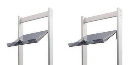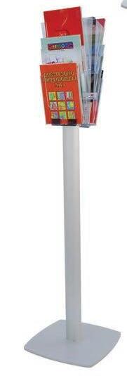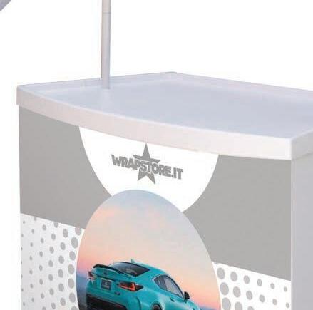Leggio con base e ripiano in PVC-HD e profili di supporto in alluminio larghezza cm. 10. Nella parte anteriore è possibile fissare cornici klik-klak per l’esposizione di messaggi pubblicitari.