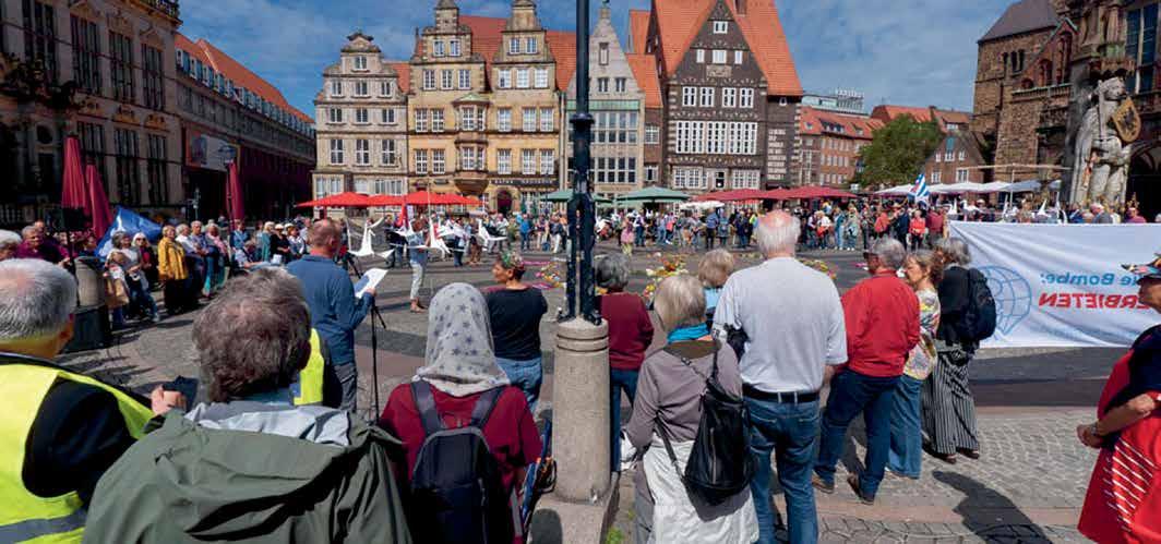 Im Herbst sind rund um den UN-Weltfriedenstag am 21. September 2023 und den Tag der deutschen Einheit am 3. Oktober 2023 zahlreiche Aktivitäten der Friedensbewegung geplant. Für einen Waffenstillstand und für Verhandlungen soll es vom 18. September über den UN-Weltfriedenstag am 21. September bis zum 24. September 2023 bundesweit Antikriegsaktionen geben. Ein Bündnis von mehr als zehn Friedens- und Menschenrechtsorganisationen – darunter die IPPNW – ruft unter dem Motto „Stoppt das Töten in der Ukraine“ zu vielfältigen Protesten gegen den Krieg Russlands in der Ukraine, für das Durchbrechen der Gewaltspirale, für einen Waffenstillstand und Friedensverhandlungen und gegen das Aufrüstungsprogramm der Bundesregierung auf, mit dem Deutschland bald einen der größten Rüstungsetats der Welt hätte. Vom 21.- 6. September 2023 findet zudem die ICANAktionswoche „Jetzt erst recht! Abgeordnete gewinnen“ statt (siehe S. 18).