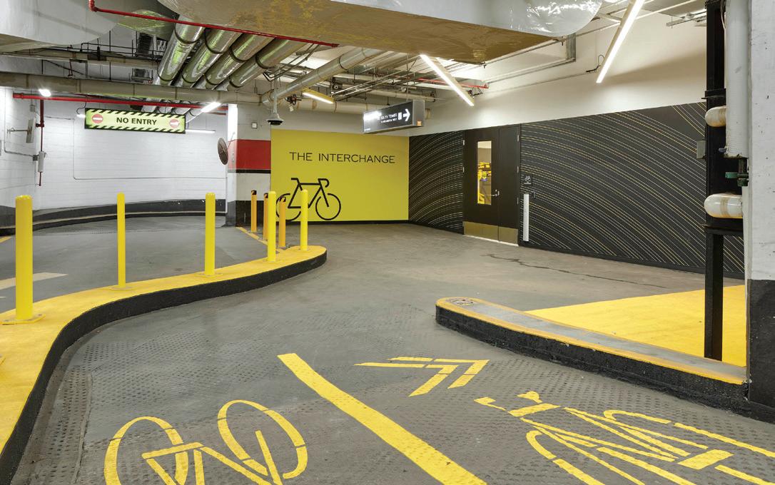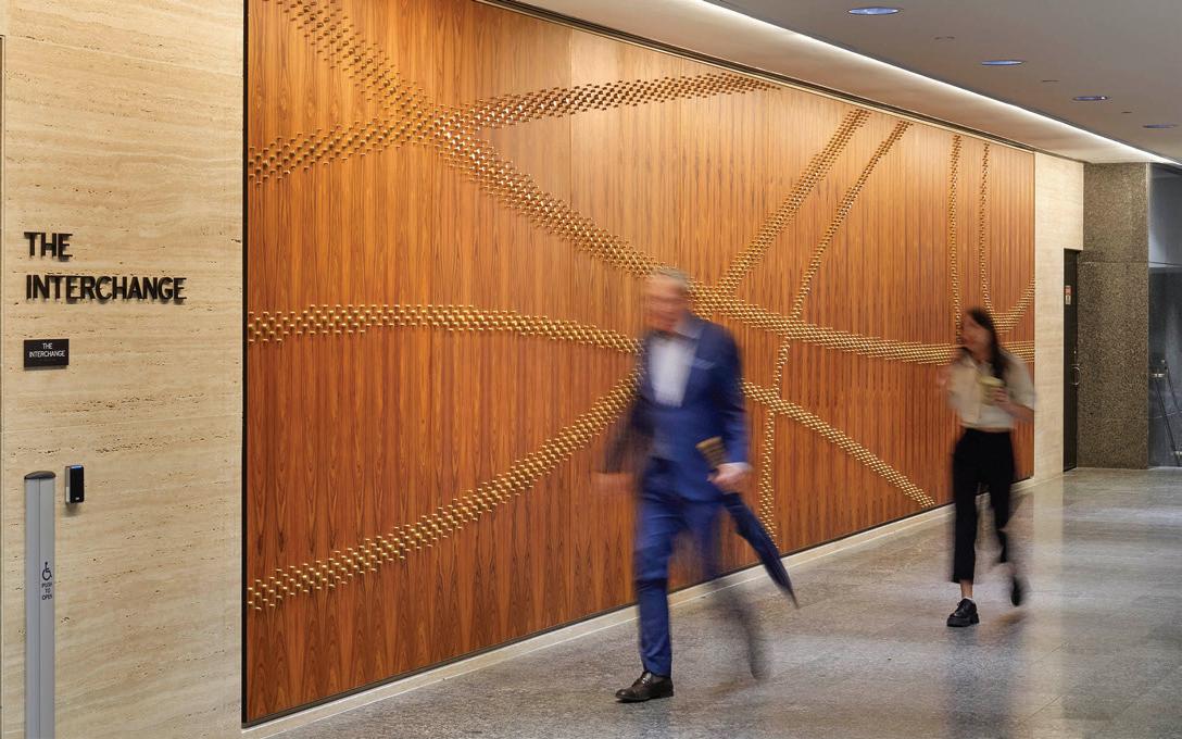 Positioned on the exposed outer skin of a demising wall, the Interchange mural faces a concourse-level tunnel within Toronto’s Financial District PATH system. Its location – highly visible, pedestrian-heavy, and woven into the city’s daily rhythm – warranted more than a utilitarian finish. It announces and marks The Interchange End-of-Trip facility to its members and prospective users with clarity and polish. The mural, comprised of 2,792 brass pegs, is a visual cue that signals transition, movement, and readiness, from city to self, echoing the flow and intention that define the space beyond its wall.
