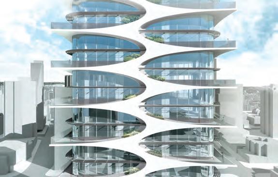 PREVIOUS PAGE Kengo Kuma’s Alberni, currently under construction, sits opposite the rounded-corner triangular tower of Peter Cardew’s classic 1500 West Georgia (formerly Crown Life Block), completed in 1978. LEFT AND BELOW Thomas Heatherwick’s design for a pair of towers at 1700 Alberni introduces playfully bulbous forms that frame generous outdoor terraces for residents.