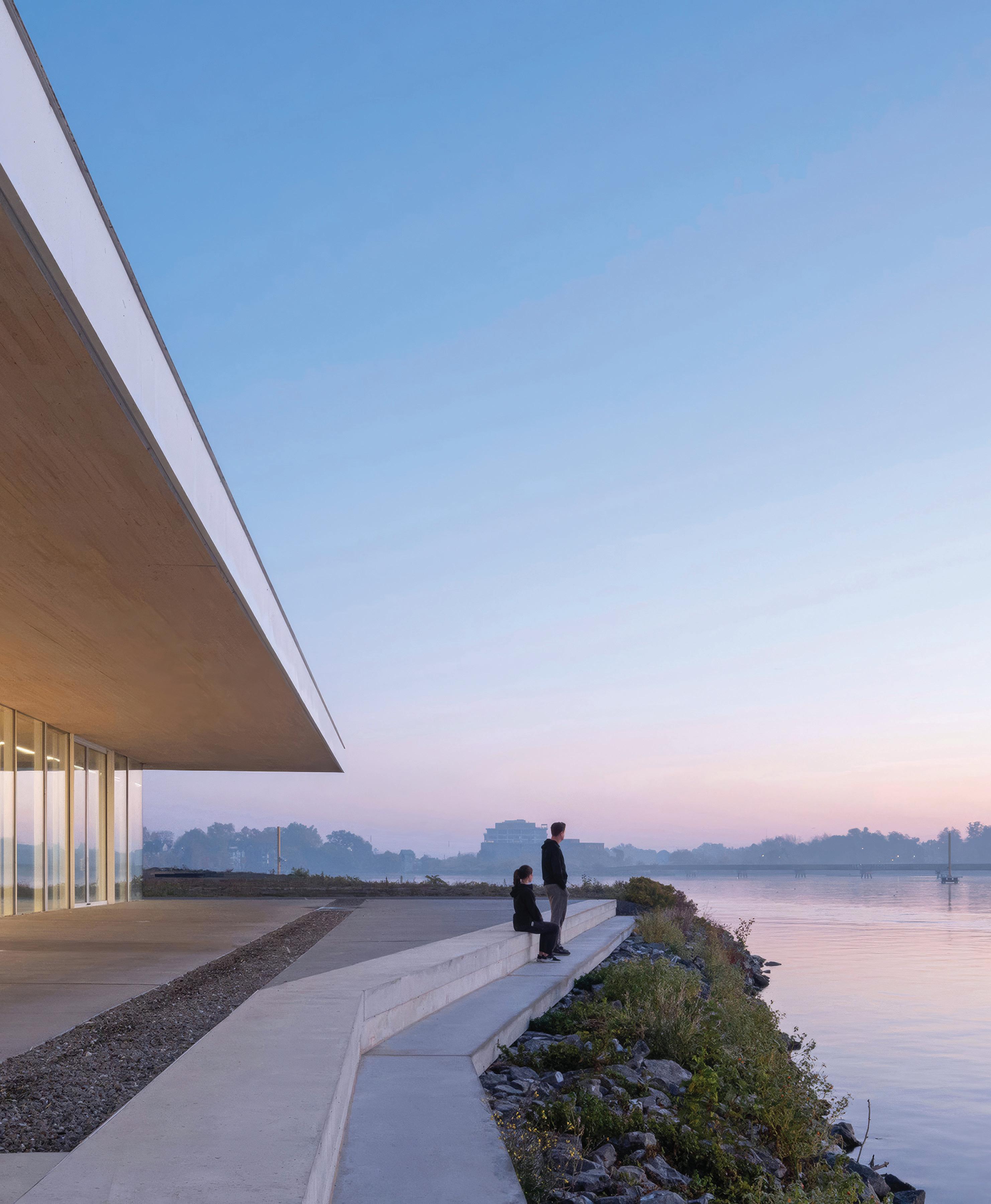 A seamless connection is created between the infinity pool swimming area, the shallow Mirror of Water, and the river, offering the illusion of bathing and strolling within the river’s embrace. A sandy beach and sea lyme grass plantings contribute to a resort-like landscape, tailored to the unique character of the waterway.