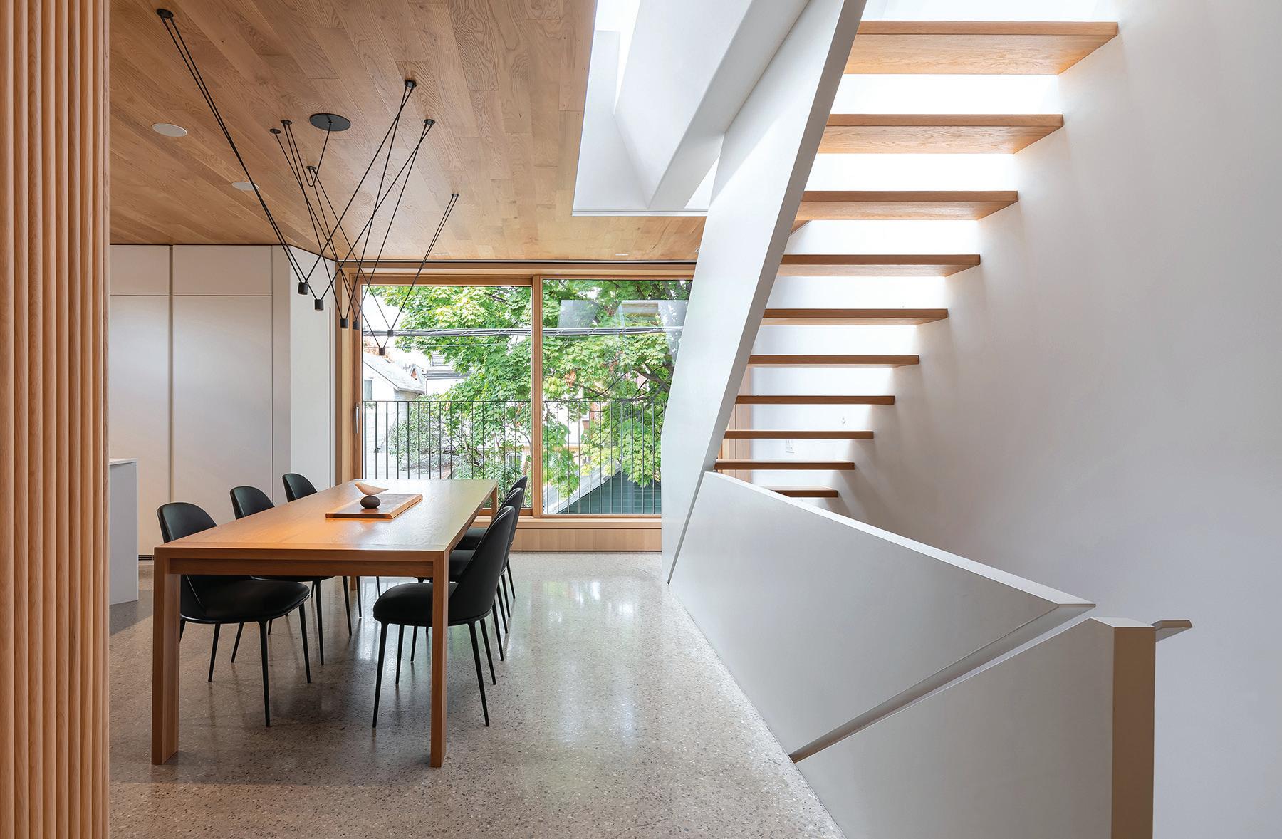 OPPOSITE A façade made from rotated bricks gives the home a distinctive presence on a west end Toronto laneway. ABOVE The four-bedroom home is planned with bedrooms on the lower two levels and open-concept living spaces at the top, looking out to the surrounding treetops. A skylit stairwell ties together the floors with natural light.