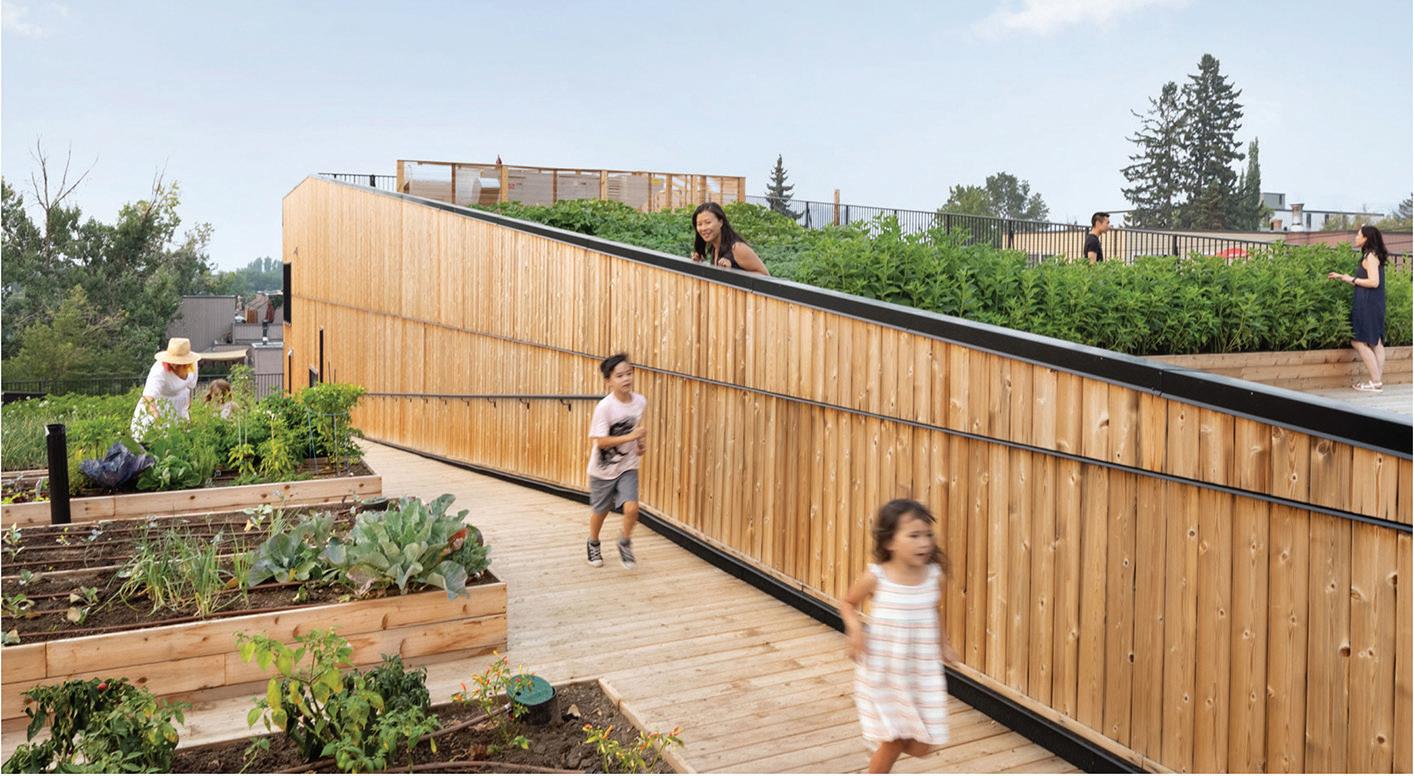 ABOVE Part of the provincial Lab-école program for new schools, the École de L’Étincelle takes shape as a series of house-like forms surrounding a courtyard. RIGHT The school’s central section is designed as a learning lab with gathering areas, a maker space, and a community kitchen.