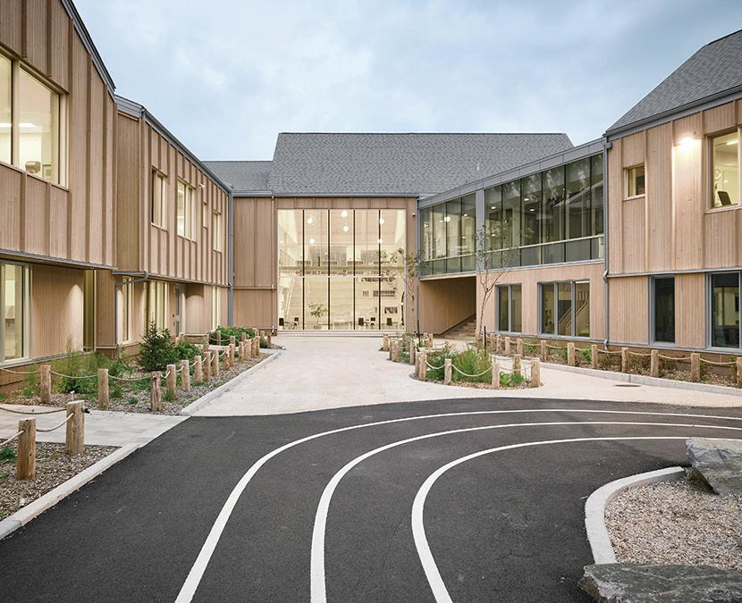 a diversity of learning activities and promote collaboration, the École de l’Étincelle proposes an original solution, organized around the courtyard. The jury notes the interest of this organization, which favours intuitive orientation for children wherever they are in the school, and offers, on the first floor, a direct relationship between each classroom occupied by the youngest pupils and the outdoor space. The scale of the building, divided into modules reminiscent of a house, contributes to the children’s sense of ownership and comfort. The jury salutes the substantial use of wood (structure, exterior cladding, interior finishes, integrated furniture), which gives the school a strong identity and helps reduce its carbon footprint.